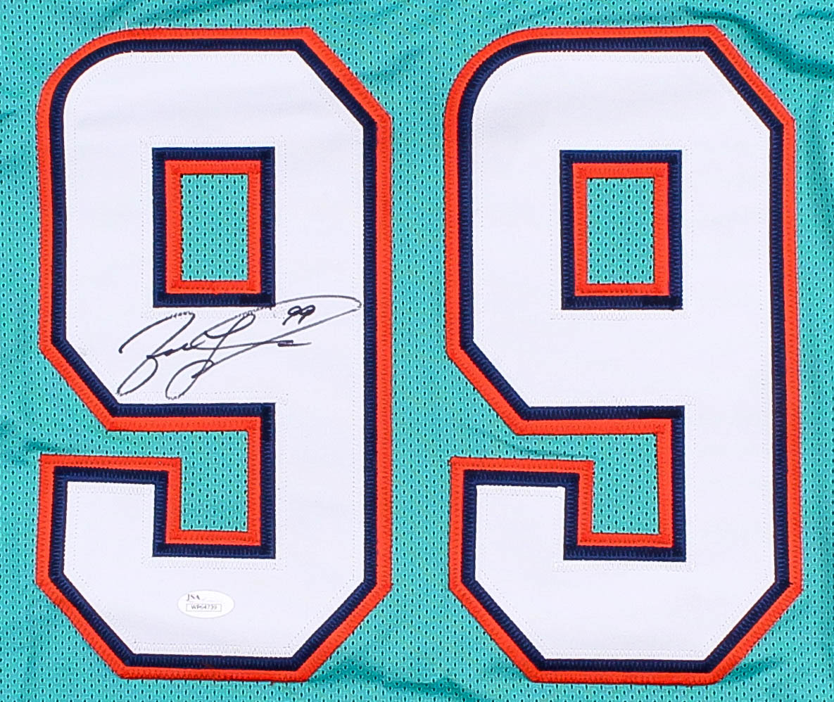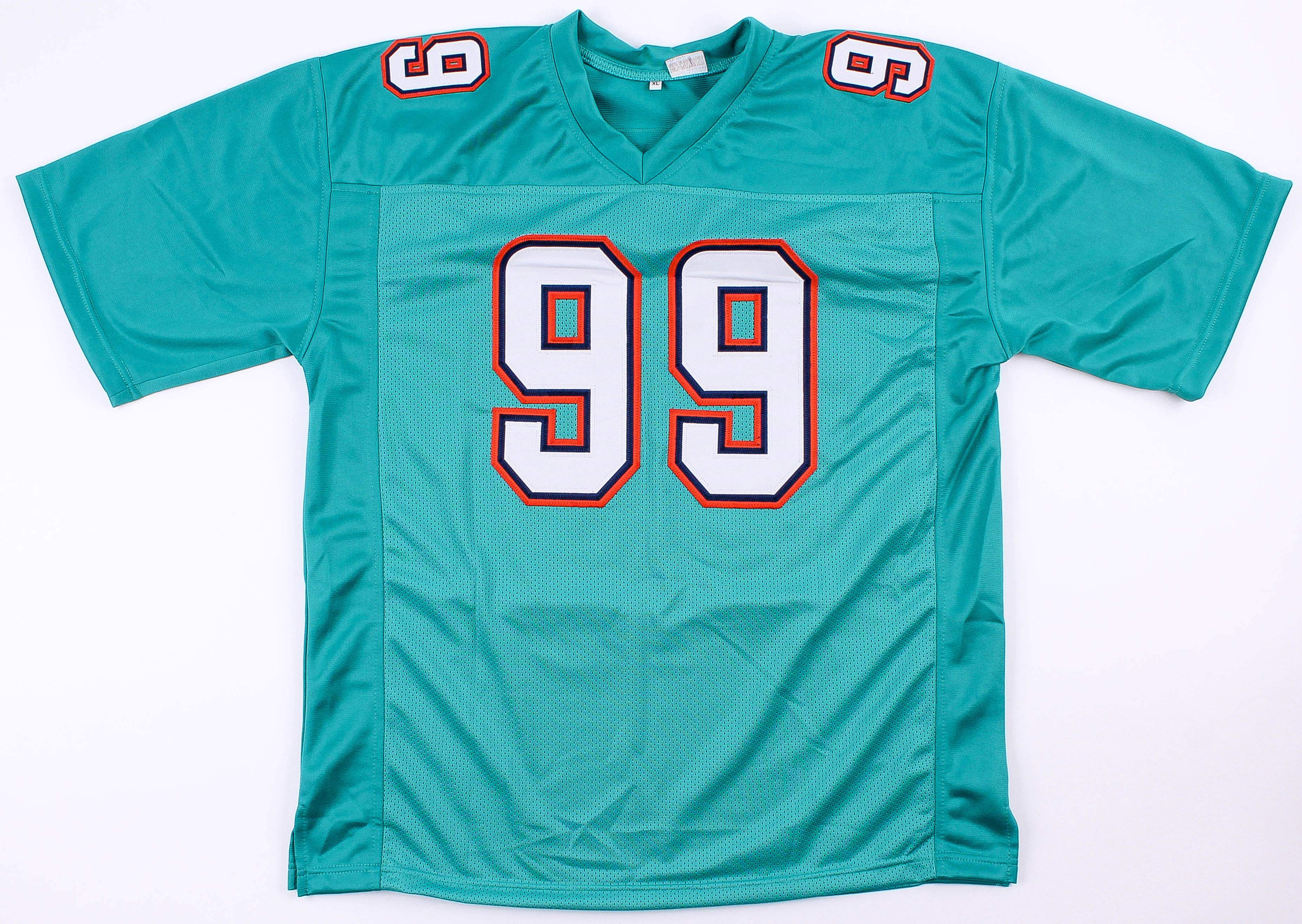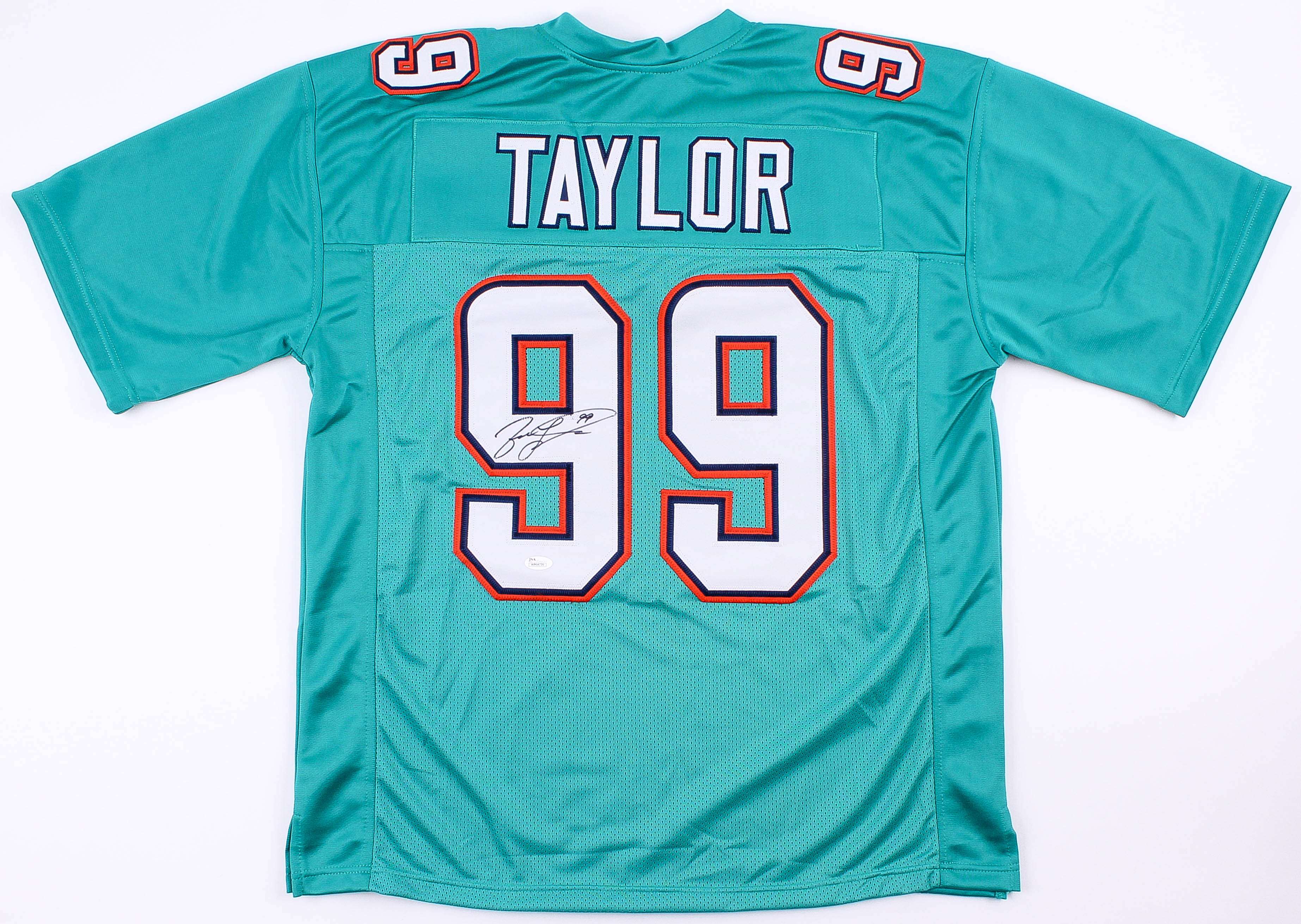 Custom on-field style jersey. Everything is sewn on, size XL. Hand-signed in black felt-tip pen by Jason Taylor (Dolphins).