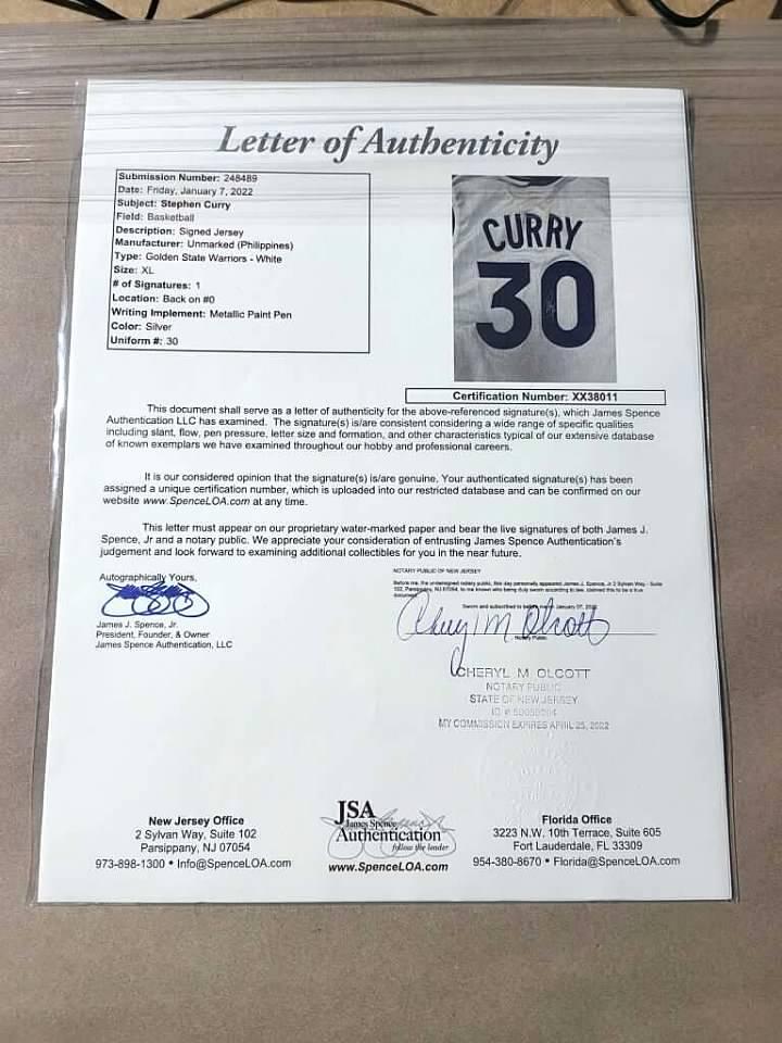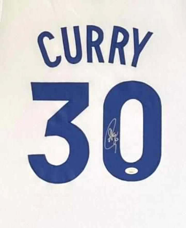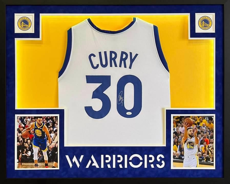 Custom framed, color-customizable LED back-lit display measures 35" x 43" in size and is matted in suede. Features a jersey that has been hand-signed by Steph Curry.