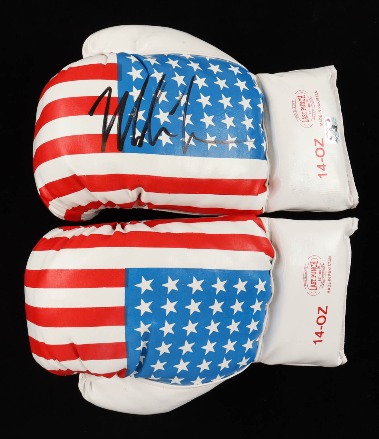 Set of (2) USA Last Punch boxing gloves. The right glove has been hand-signed by Mike Tyson.