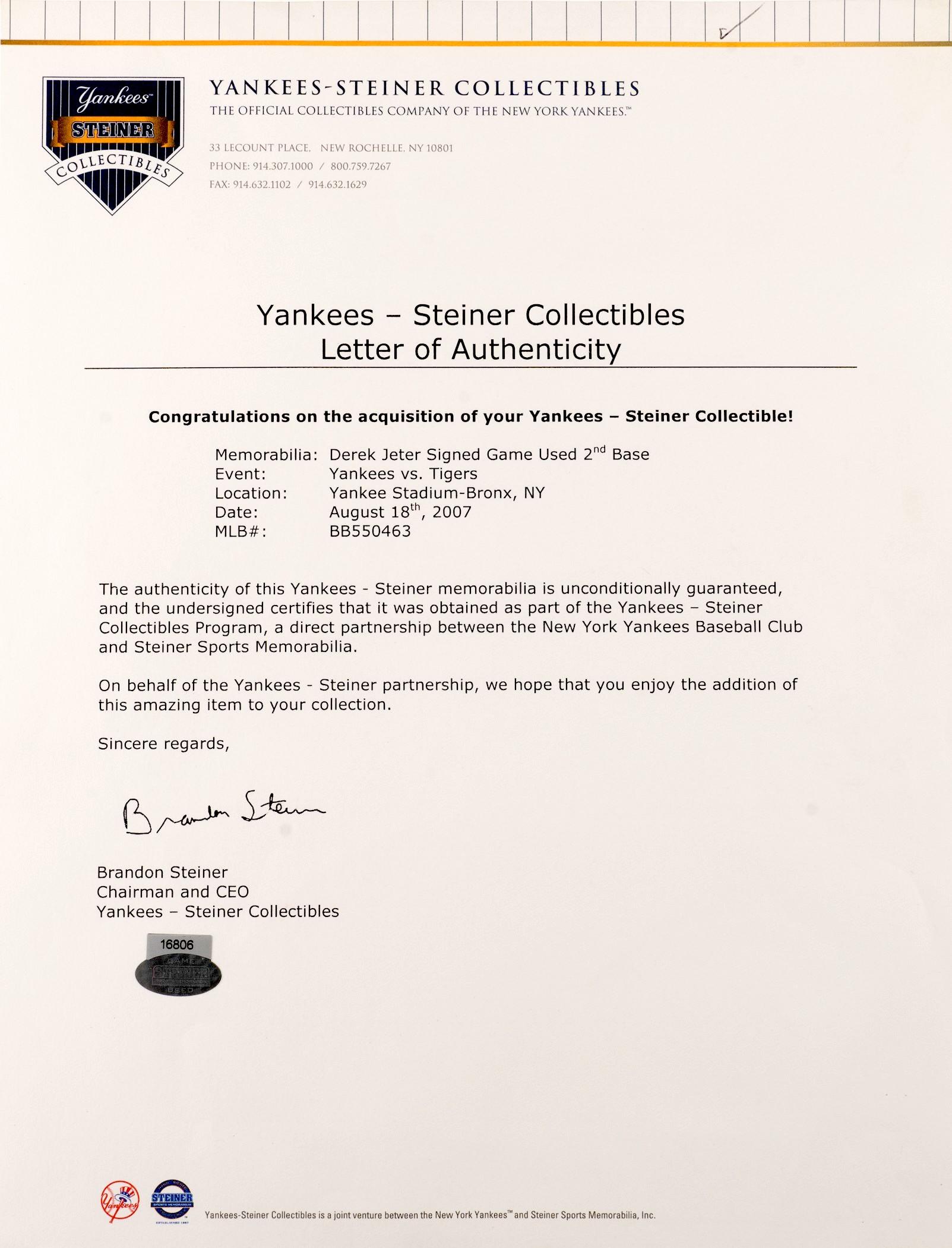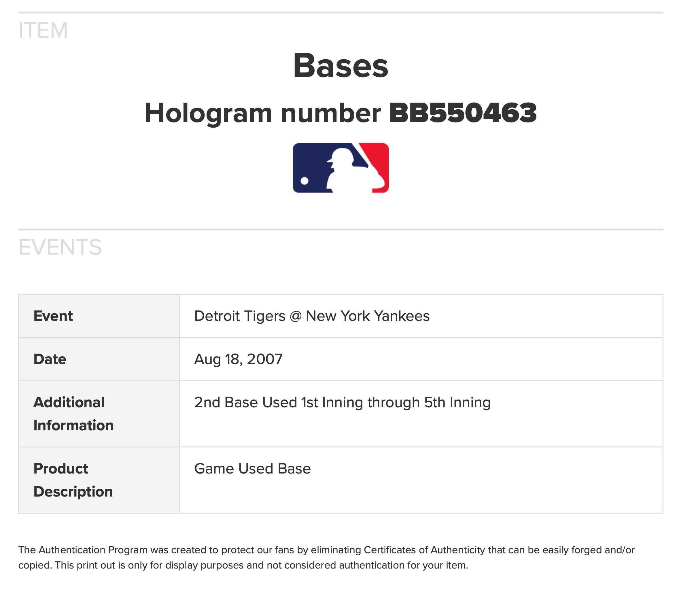The base was game-used between the New York Yankees and Detroit Tigers at Yankee Stadium on August 18, 2007. Roger Clemens earned the win and Mariano Rivera had a save. Derek Jeter went 1 for 4 and Jorge Posada hit a home run.