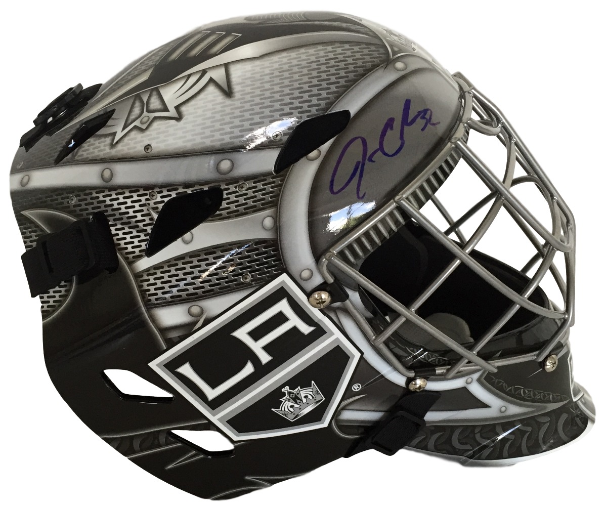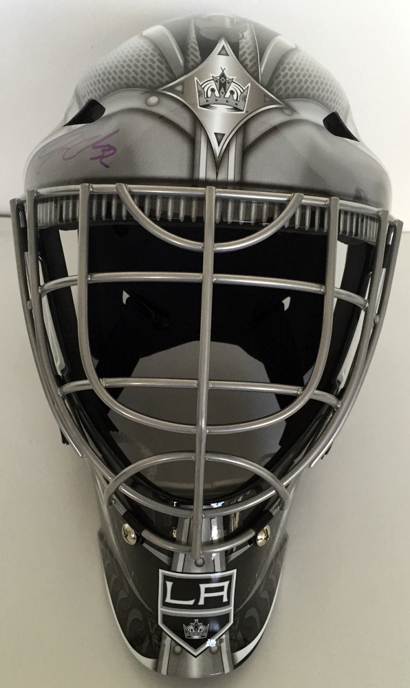 Los Angeles Kings full-size replica goalie mask. Hand-signed in blue felt-tip pen by Jonathan Quick (Kings).