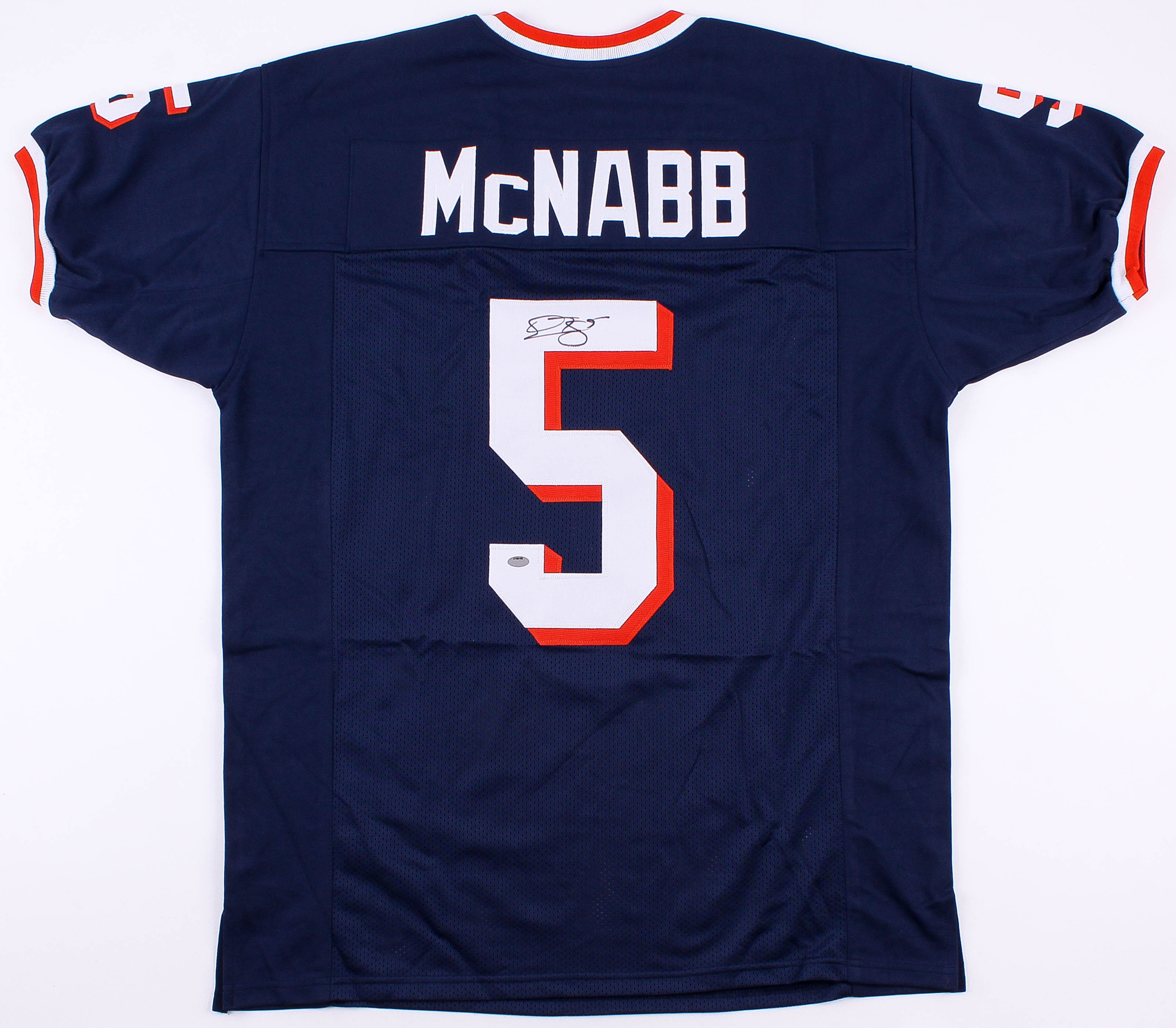 Custom on-field style jersey. Everything is sewn on, size XL. Hand signed in black felt tip pen by Donovan McNabb (Eagles).