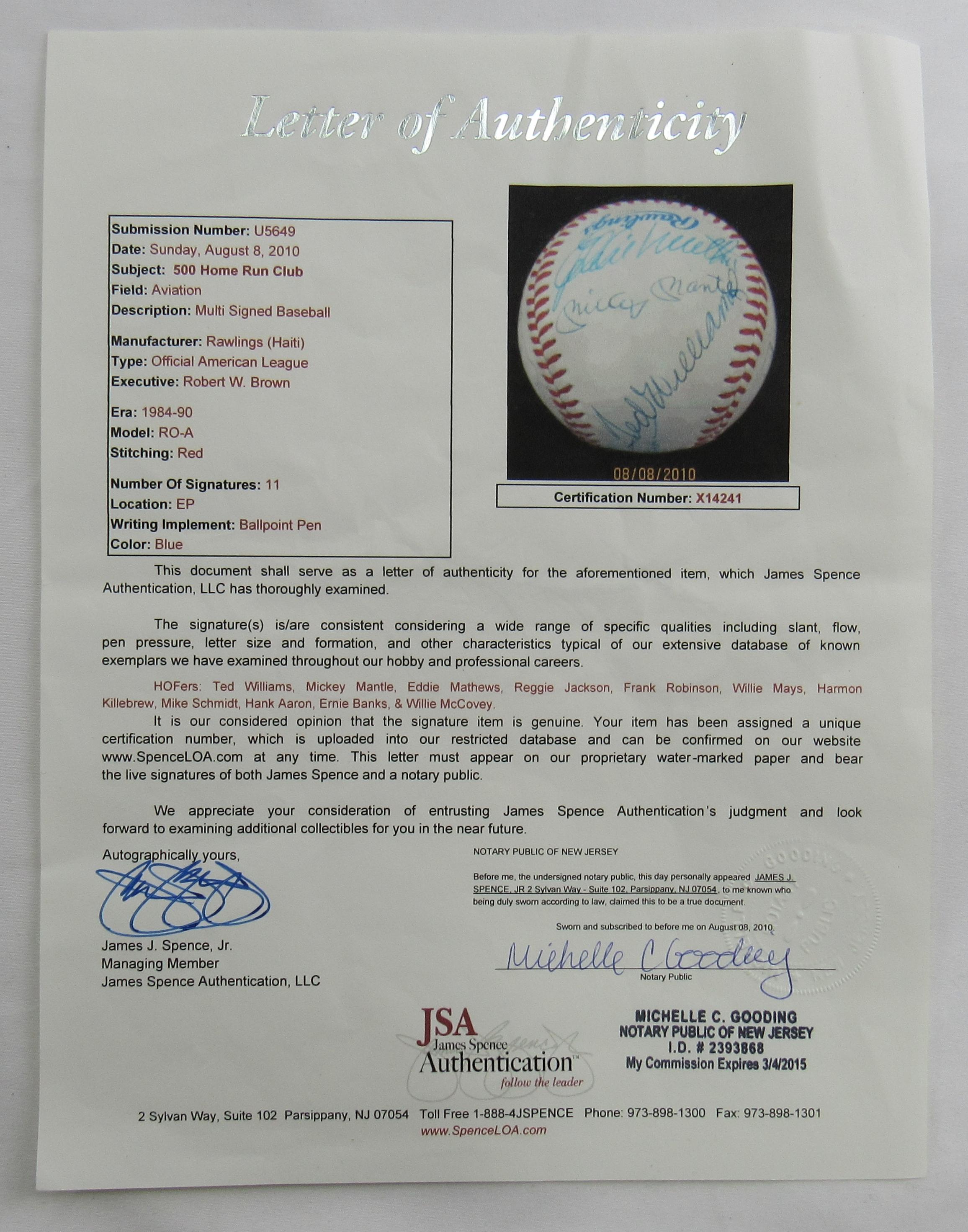 500 HR Club OAL Baseball signed by (11) with Mickey Mantle, Ted Williams, Willie Mays, Hank Aaron (JSA)