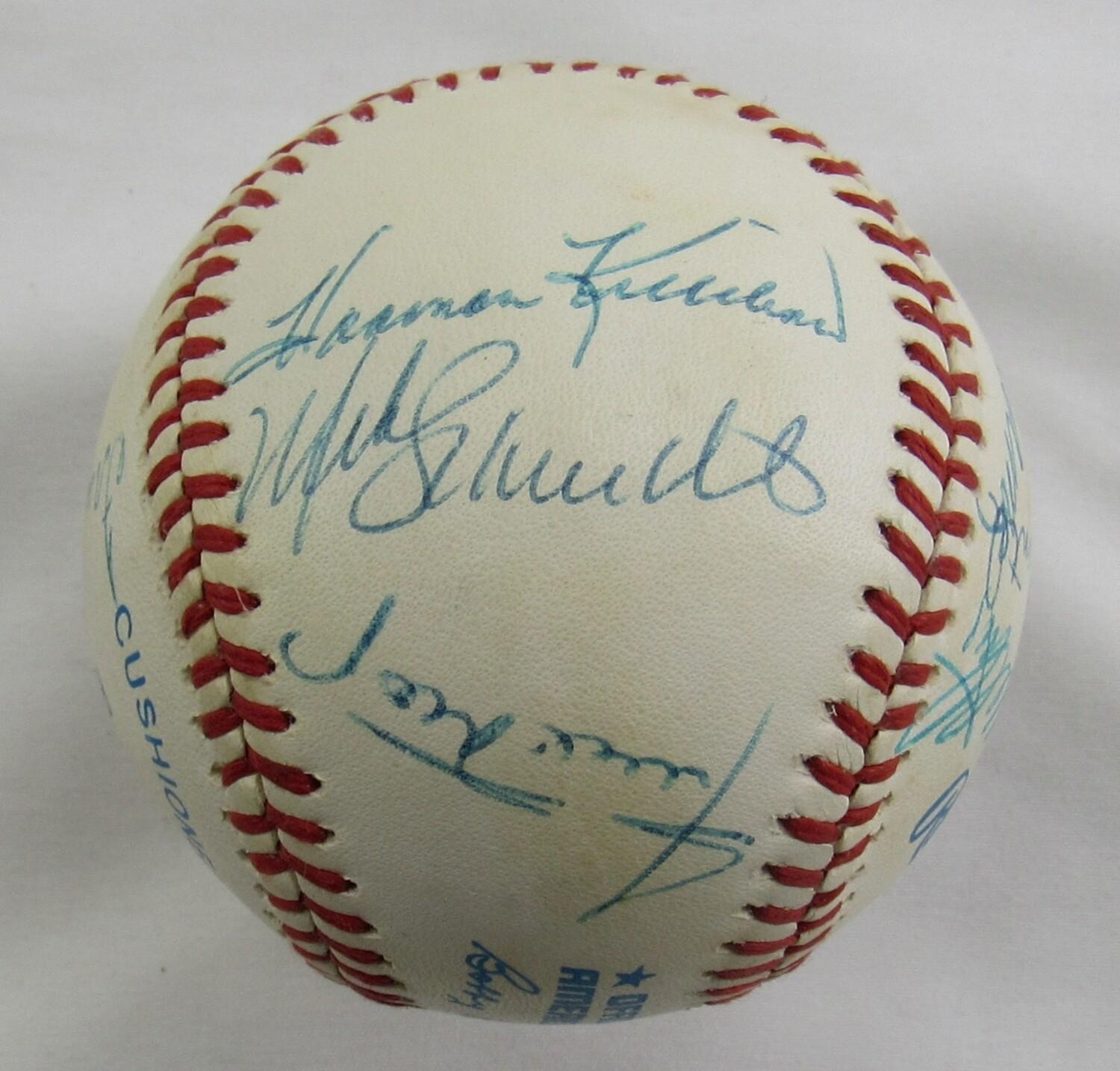 Rawlings Official American League baseball hand-signed by (11) with Mickey Mantle, Ted Williams, Willie Mays, Hank Aaron, Reggie Jackson, Eddie Mathews, Frank Robinson, Harmon Killebrew, Mike Schmidt, Ernie Banks and Willie McCovey. Please note, the baseball is naturally toned.
