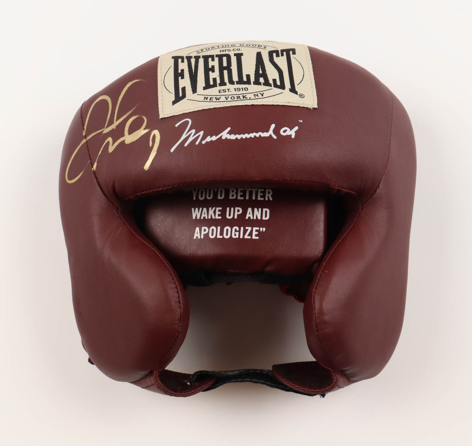 Vintage Everlast boxing headgear has been hand-signed by Floyd Mayweather Jr. (HOF). Please note, the Muhammad Ali signature is a facsimile.