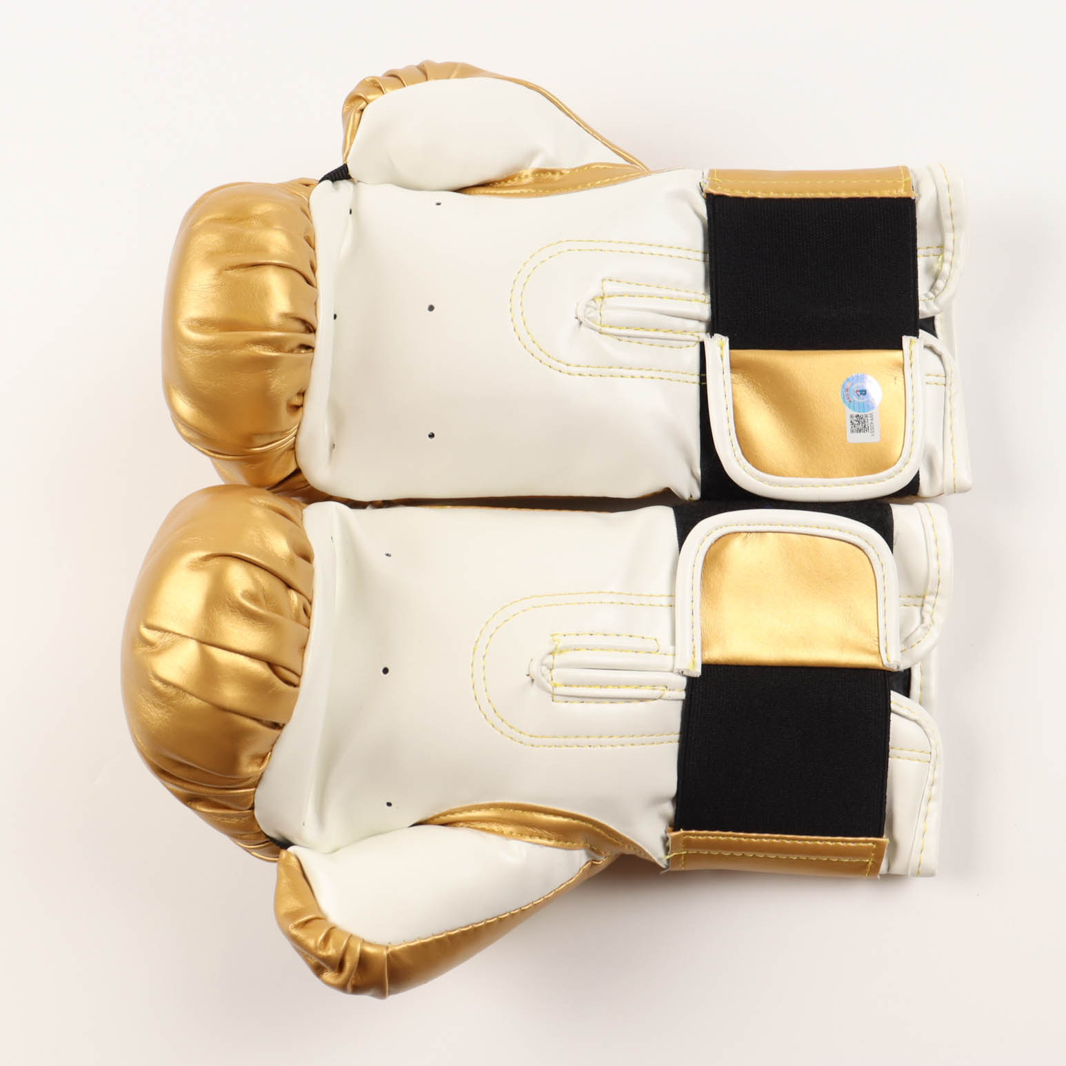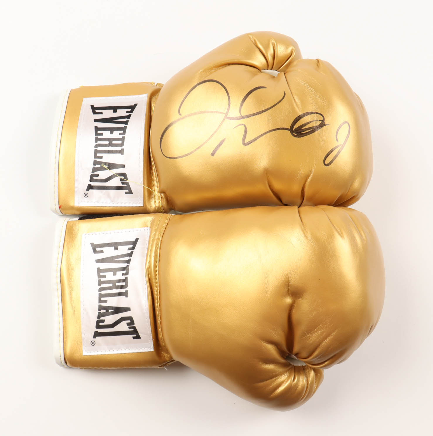 Pair of Gold Everlast boxing gloves. Right-handed glove has been hand-signed by Floyd Mayweather Jr. (HOF).