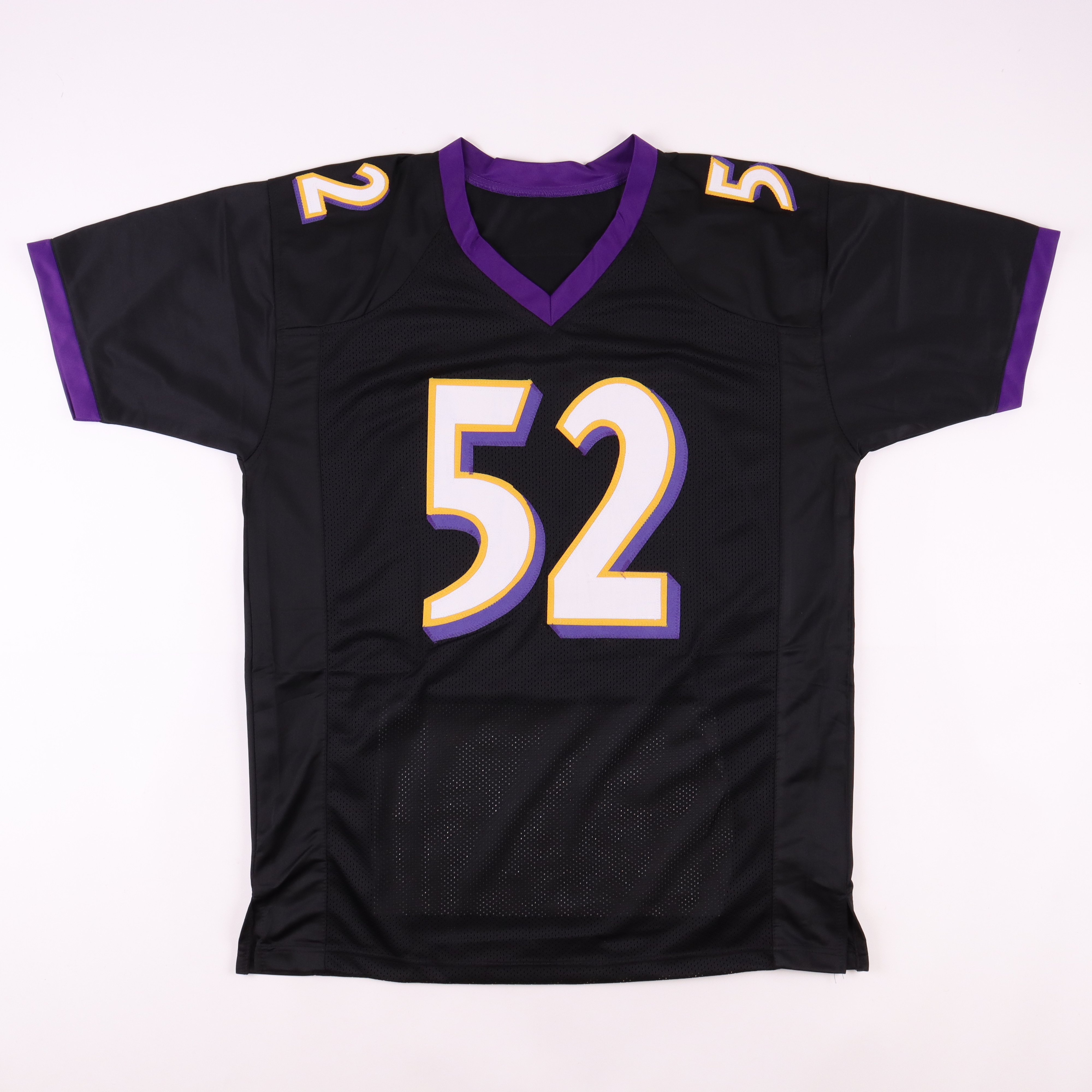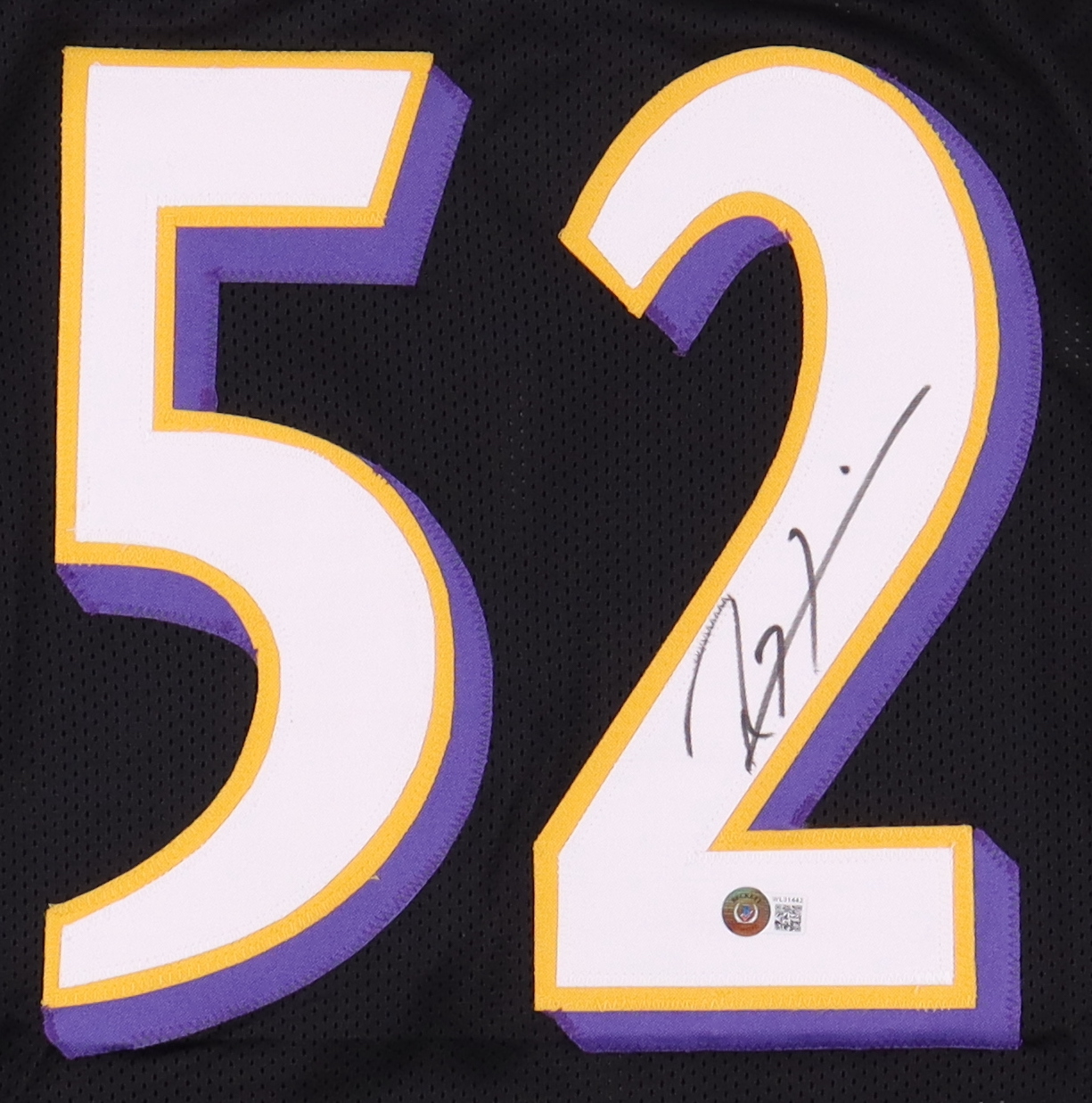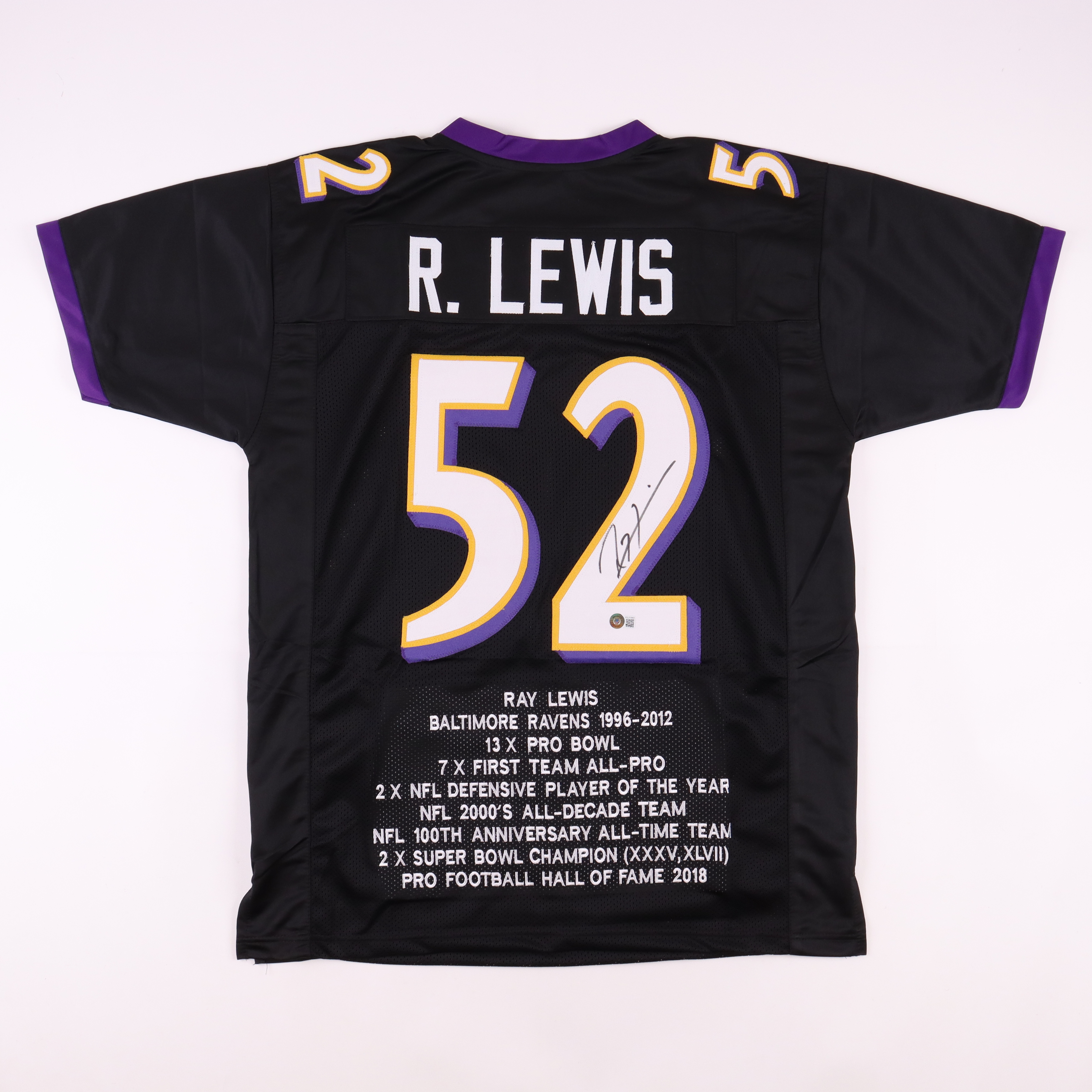 Custom on-field style jersey. Everything sewn on, size XL. Hand-signed by Ray Lewis (HOF). Lewis' career stats are custom stitched into the jersey below the reverse numbers.