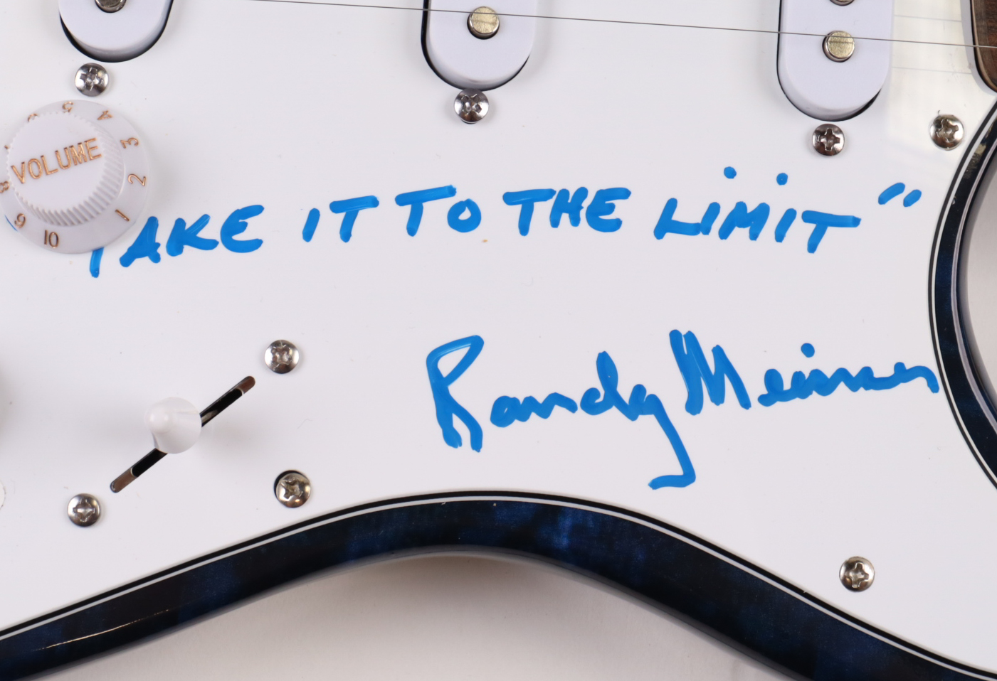 Custom electric guitar measures approximately 39" in length and has been hand-signed and inscribed on the pickguard by Randy Meisner (HOF).