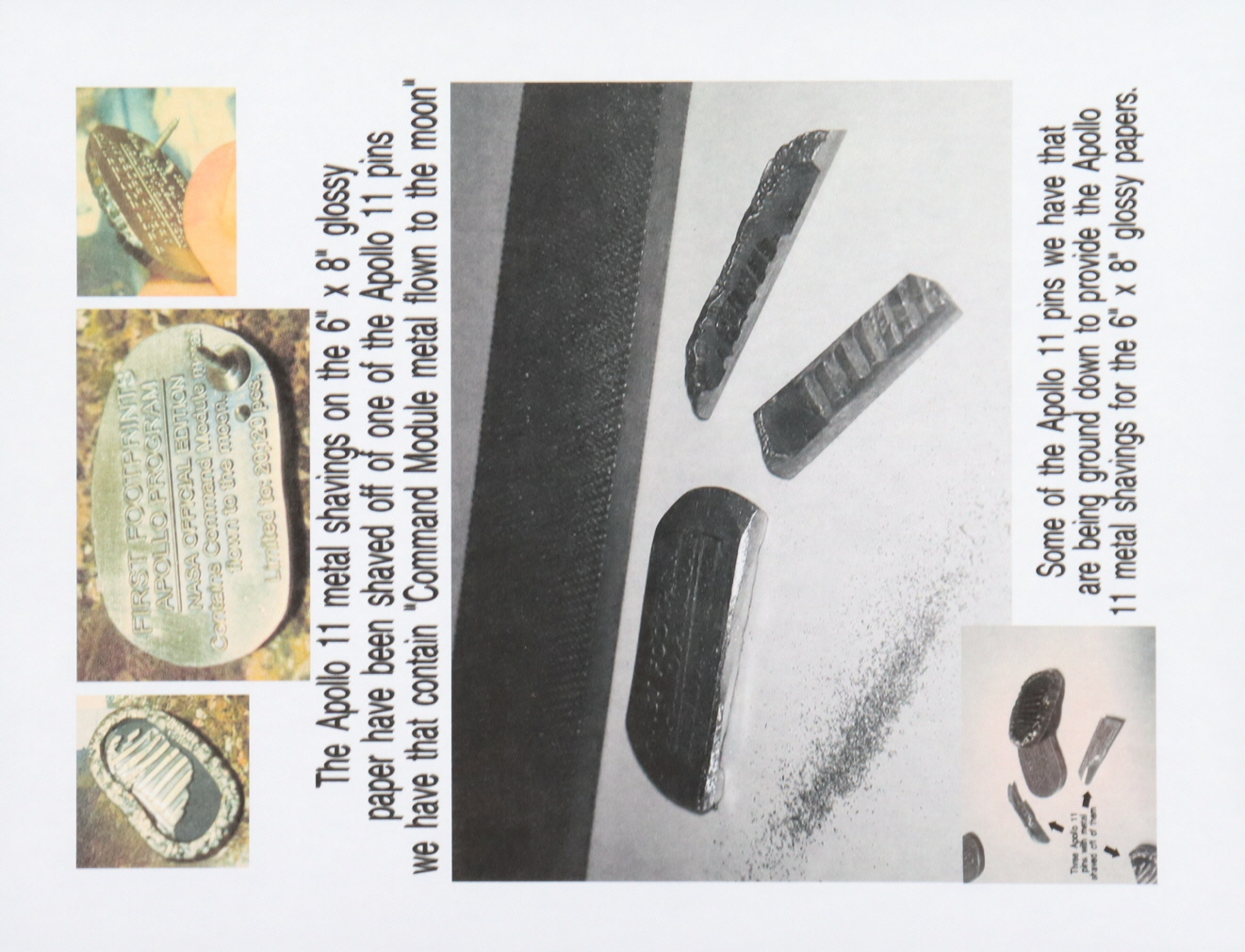 The photo measures approximately 6" x 9" and features metal from the Apollo 11 spacecraft that NASA Astronaut Commander Neil Armstrong and Lunar Module Astronaut Pilot Buzz Aldrin returned to earth in July 1969.