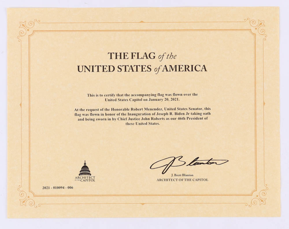 American Flag was flown over the United States Capitol on January 20th, 2021. At the request of the Honorable Robert Menendez, United States Senator, this flag was flown for the inauguration of Joseph R. Biden Jr. taking the oath and becoming our 46th President of these United States.