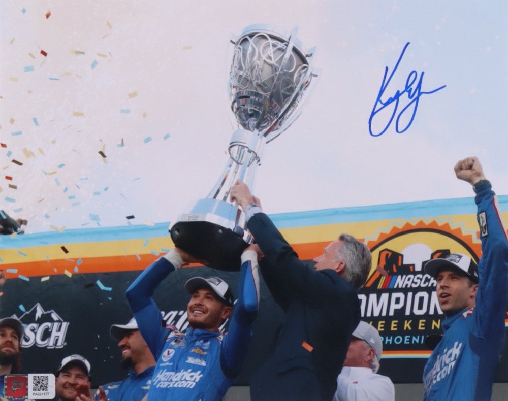 Photo measures 8" x 10" in size and has been hand-signed by Kyle Larson.