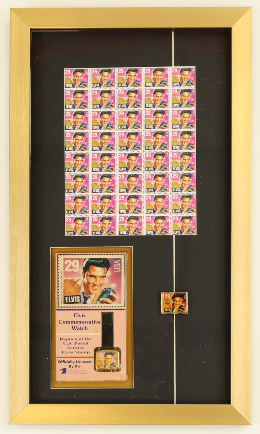 Elvis Presley Custom Framed Uncut U.S. Postage Stamp Sheet with Metal Stamp & Vintage Stamp Watch in Original Packaging