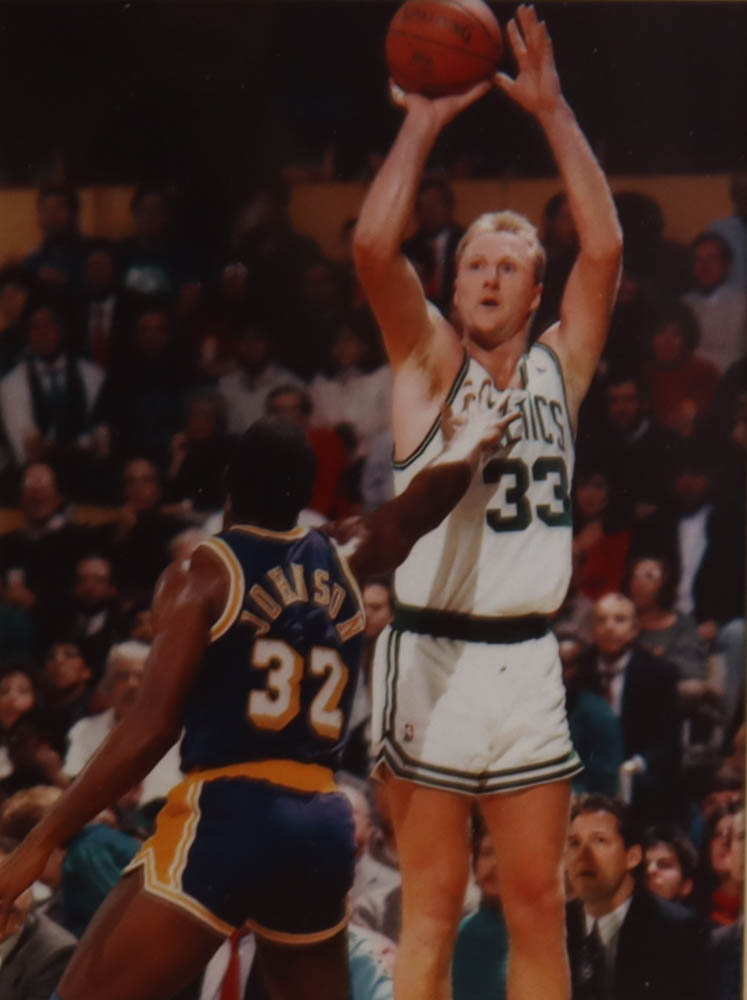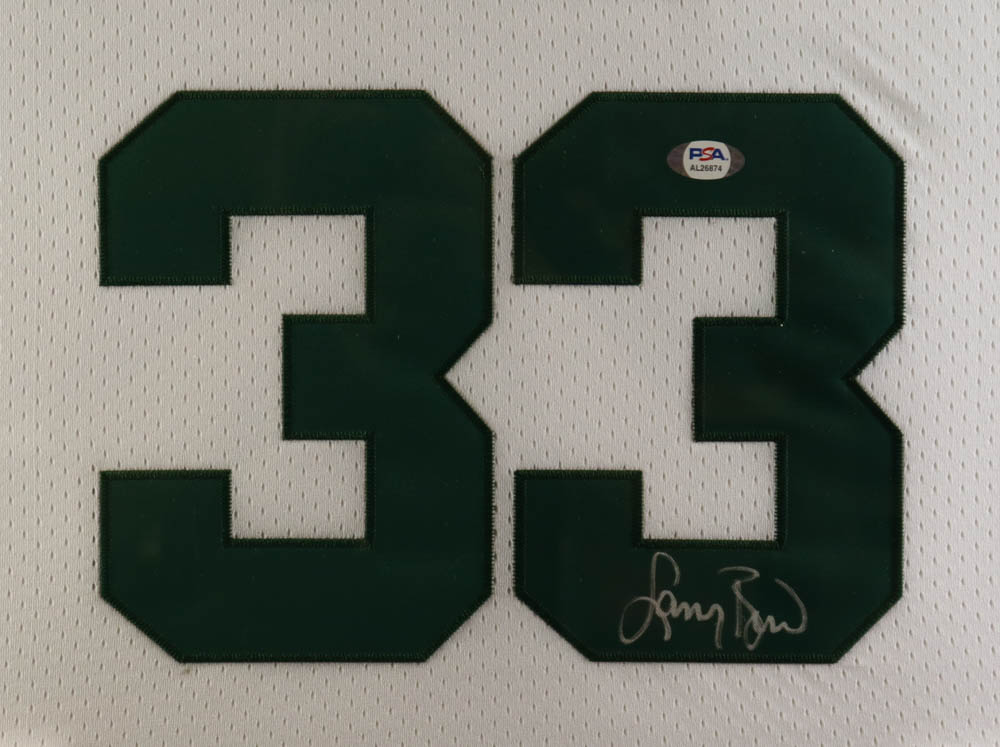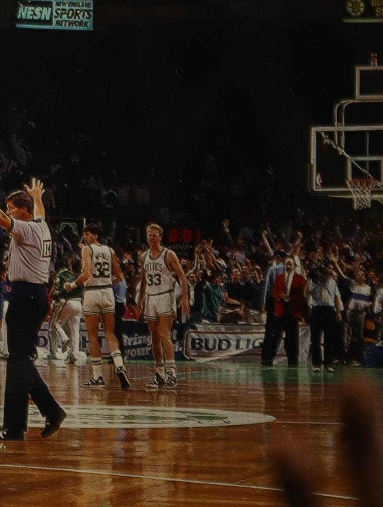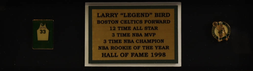 Custom frame measures approximately 32" x 36" in size and features a jersey hand-signed by Larry Bird (HOF). Display also features (3) vintage Celtics pin and (1) Bird Jersey pin, (2) 8x10 photos and (2) Boston Celtics cloth patches.