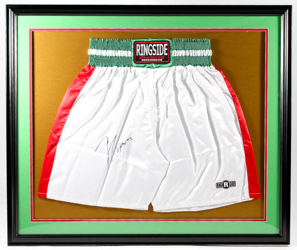 Custom framed display measures 32.5" x 39" in size and features a pair of boxing shorts that have been hand-signed in black felt tip pen by Julio Cesar Chavez.