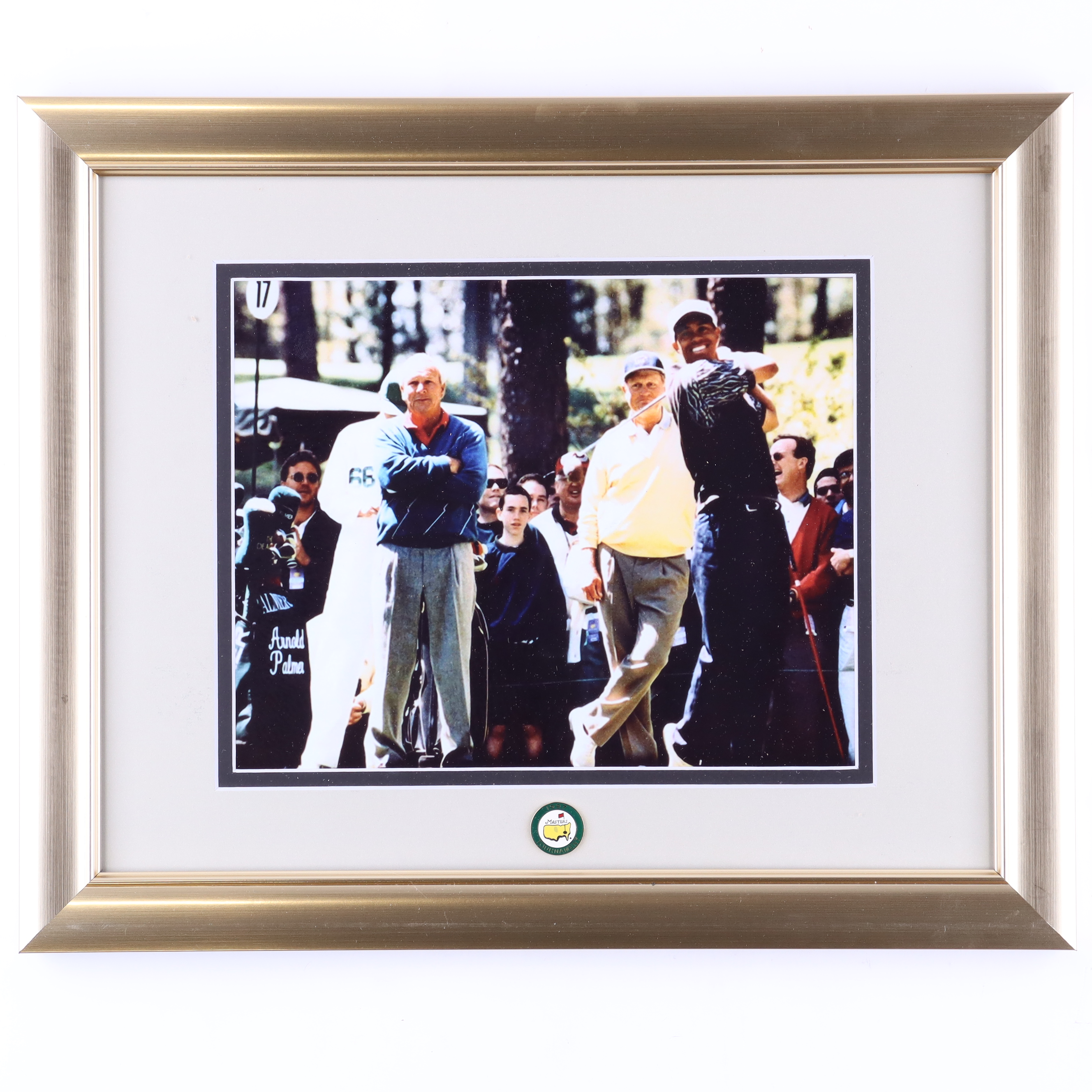 Custom frame measures 13" x 16" in size and features a photo of Tiger Woods (HOF), Arnold Palmer (D. 2015, HOF) and Jack Nicklaus (HOF). Display also features a Masters pin.