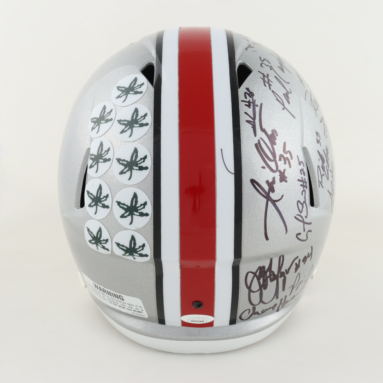 Ridell Ohio State Buckeyes full-size replica Speed helmet. Hand-signed by Tim Spencer, Jeff Logan, Derek Combs, Pete Johnson, Michael Wiley, Chris Beanie Wells, Ric Volley, Champ Henson, Jim Otis, Paul Campbell, Vince Workman, John Woolridge, Keith Byars, George Cooper, Mike Weber, Jr., Antonio Pittman, Carlos Snow, Carlos Hyde, Vaughn Broadnax, Pepe Pearson, Butler B'ynote', Jordan Hall, and Rick Galbos.