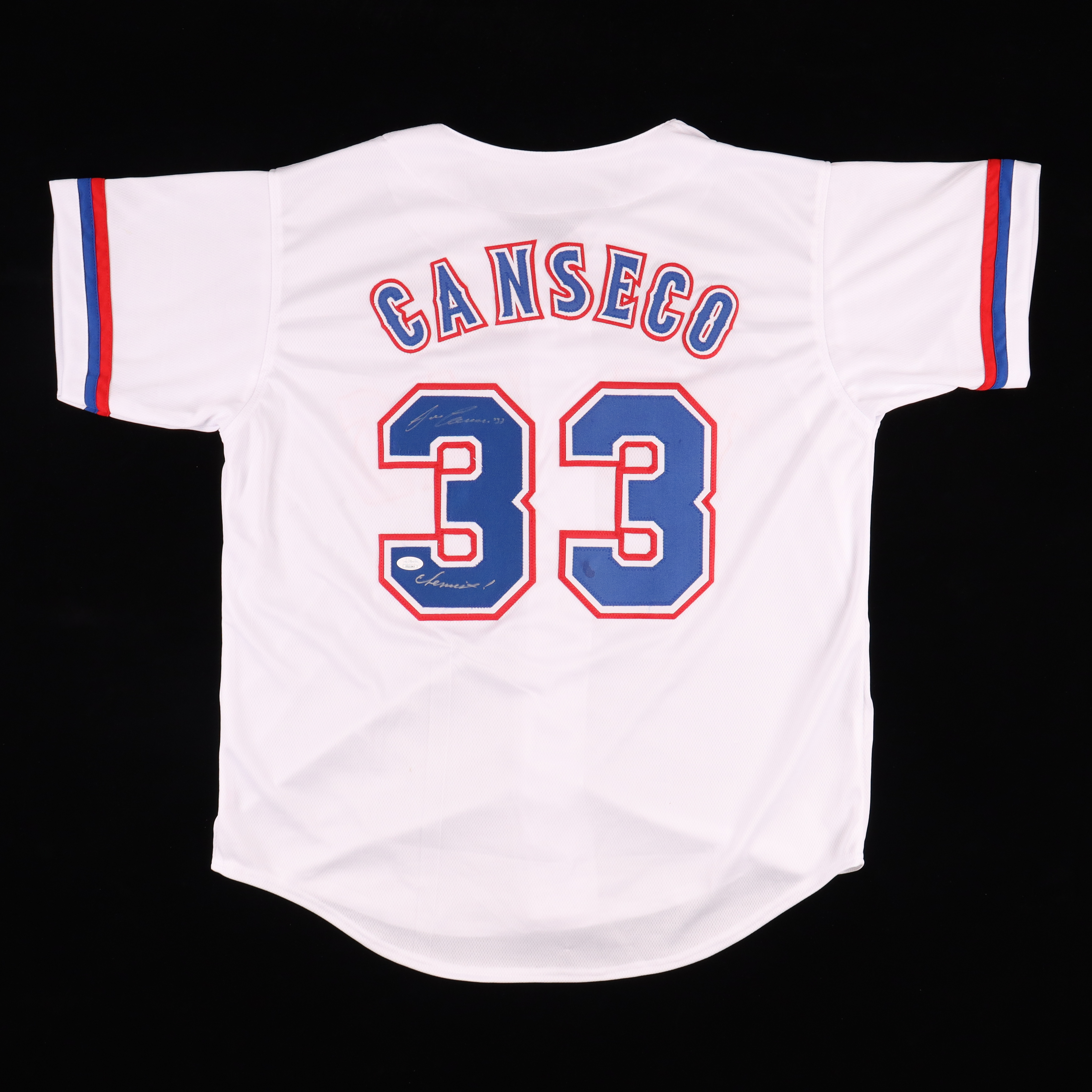 Custom on-field style jersey. Everything is sewn on, size XL. Hand-signed and inscribed by Jose Canseco. Please note that the jersey shows minor signs of staining on the rear jersey number.