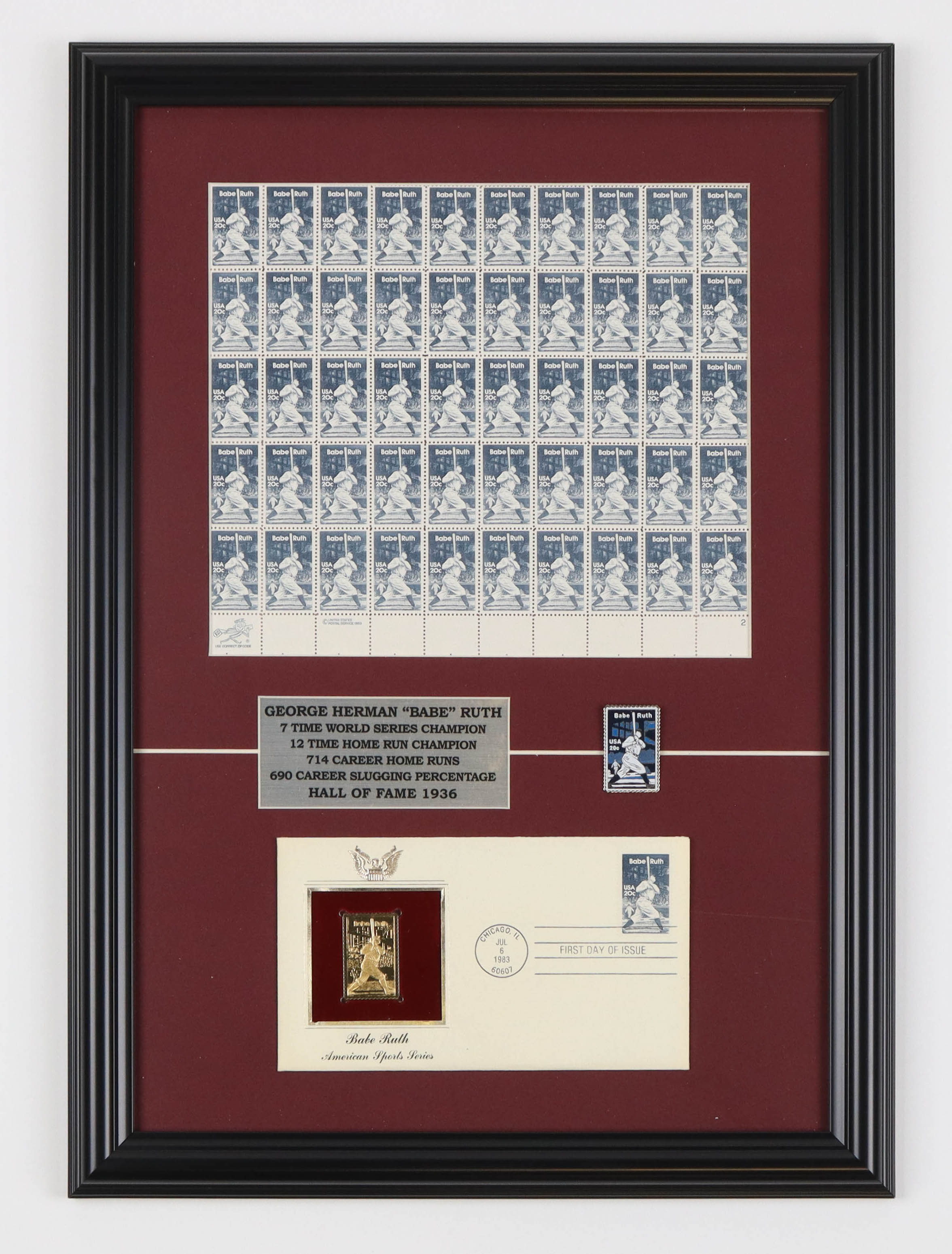 Custom frame measures approximately 15" x 21" in size and features a 1983 uncut U.S. stamp sheet of George Herman "Babe" Ruth (D. 1948, New York Yankees, HOF) with (50) stamps, a First Day Issue envelope and a 1983 stamp release pin.