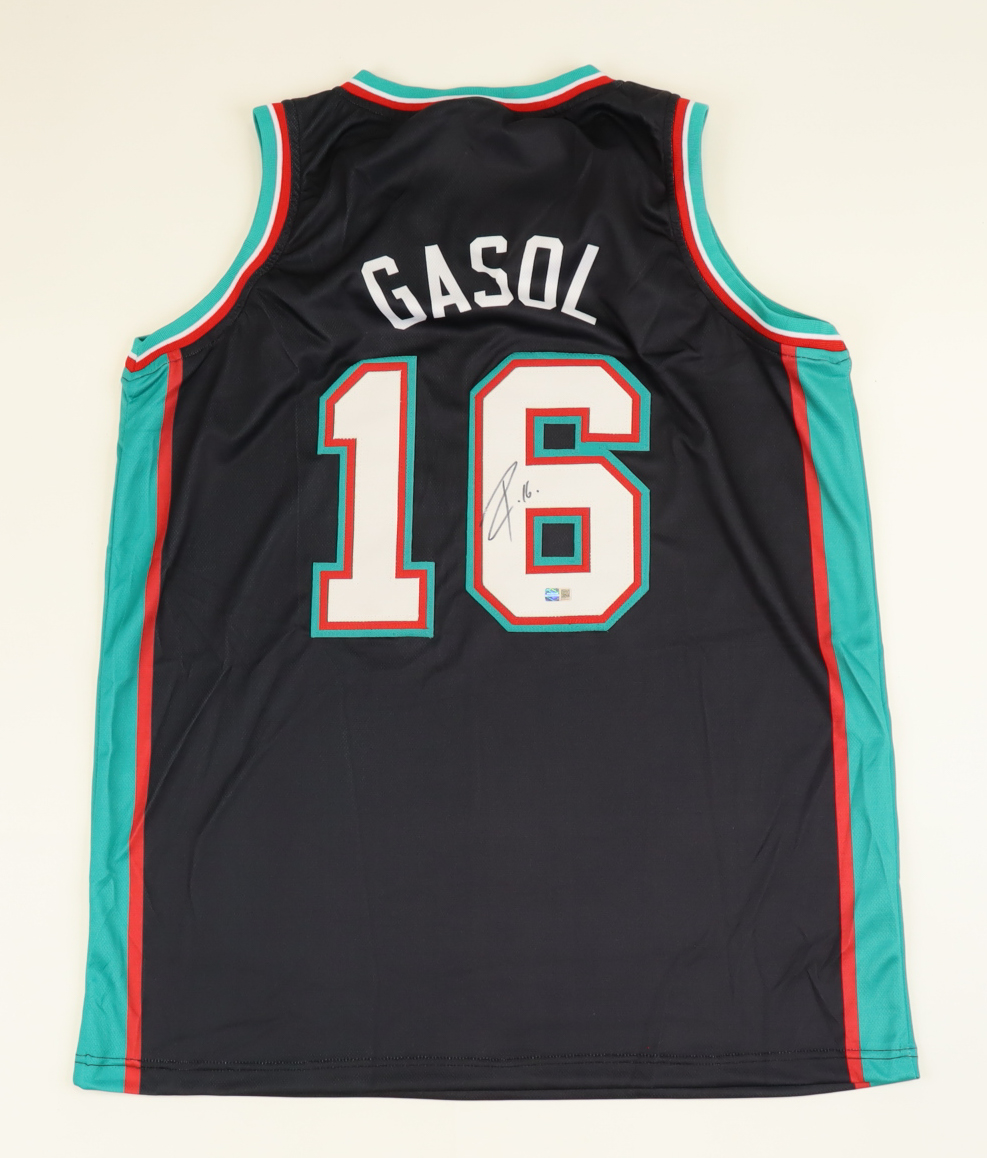 Custom on-court style jersey. Everything is sewn on, size XL. Hand-signed by Pau Gasol.