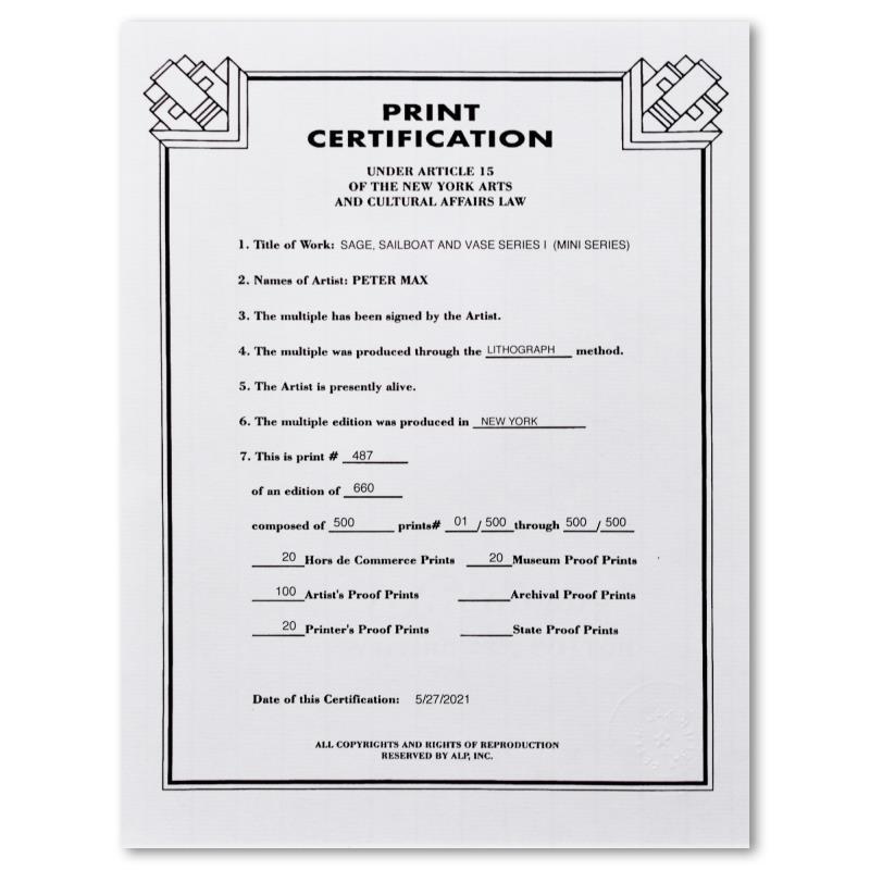 "Sage, Sailboat and Vase Series I" is a limited edition lithograph on paper by Peter Max, numbered 487/500 and hand signed by the artist. This piece comes framed. Includes Certificate of Authenticity from Peter Max Studios. Measures approximately 17" x 16".