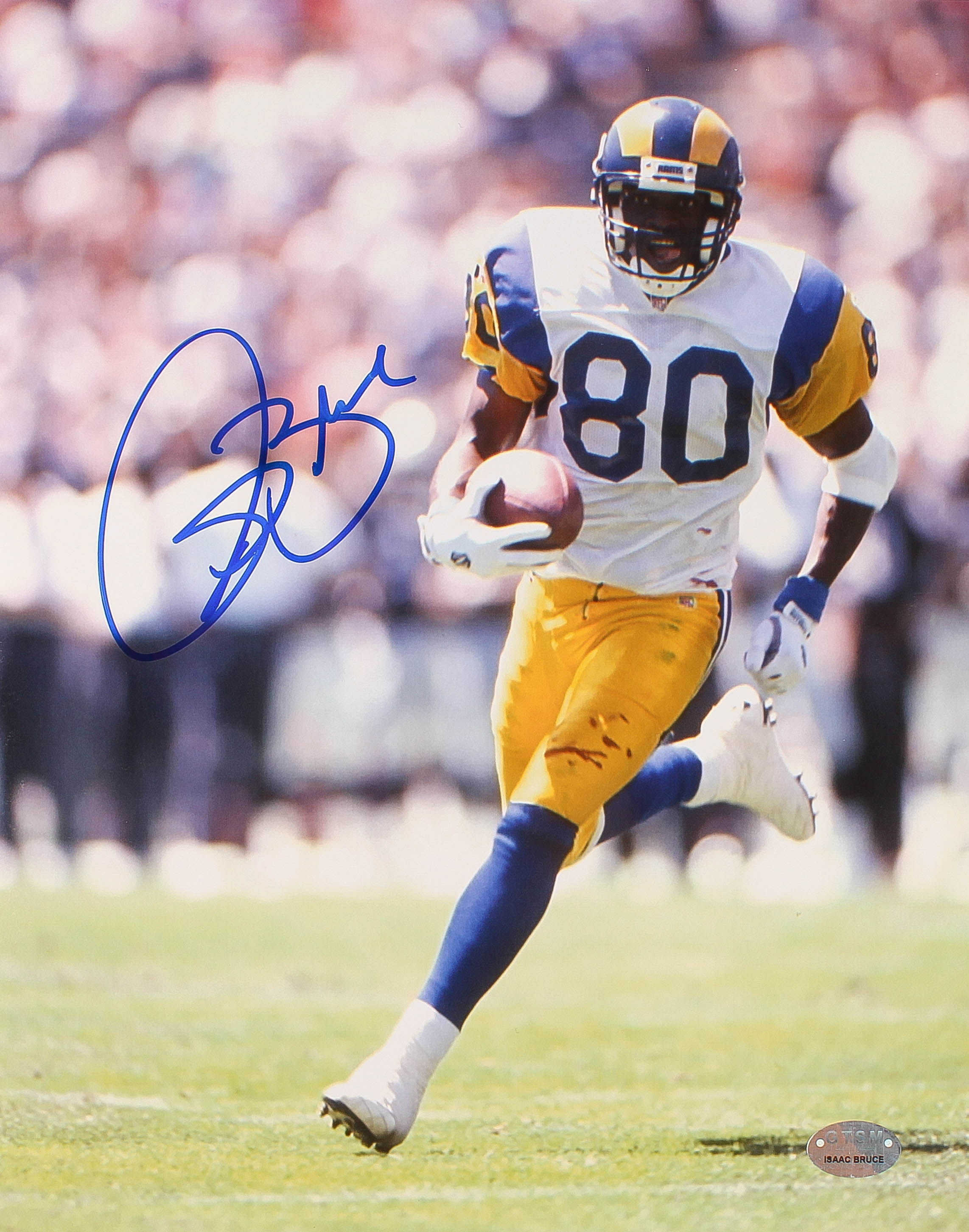 Photo measures 8" x 10" in size and has been hand-signed in blue felt-tip pen by Isaac Bruce (Rams).