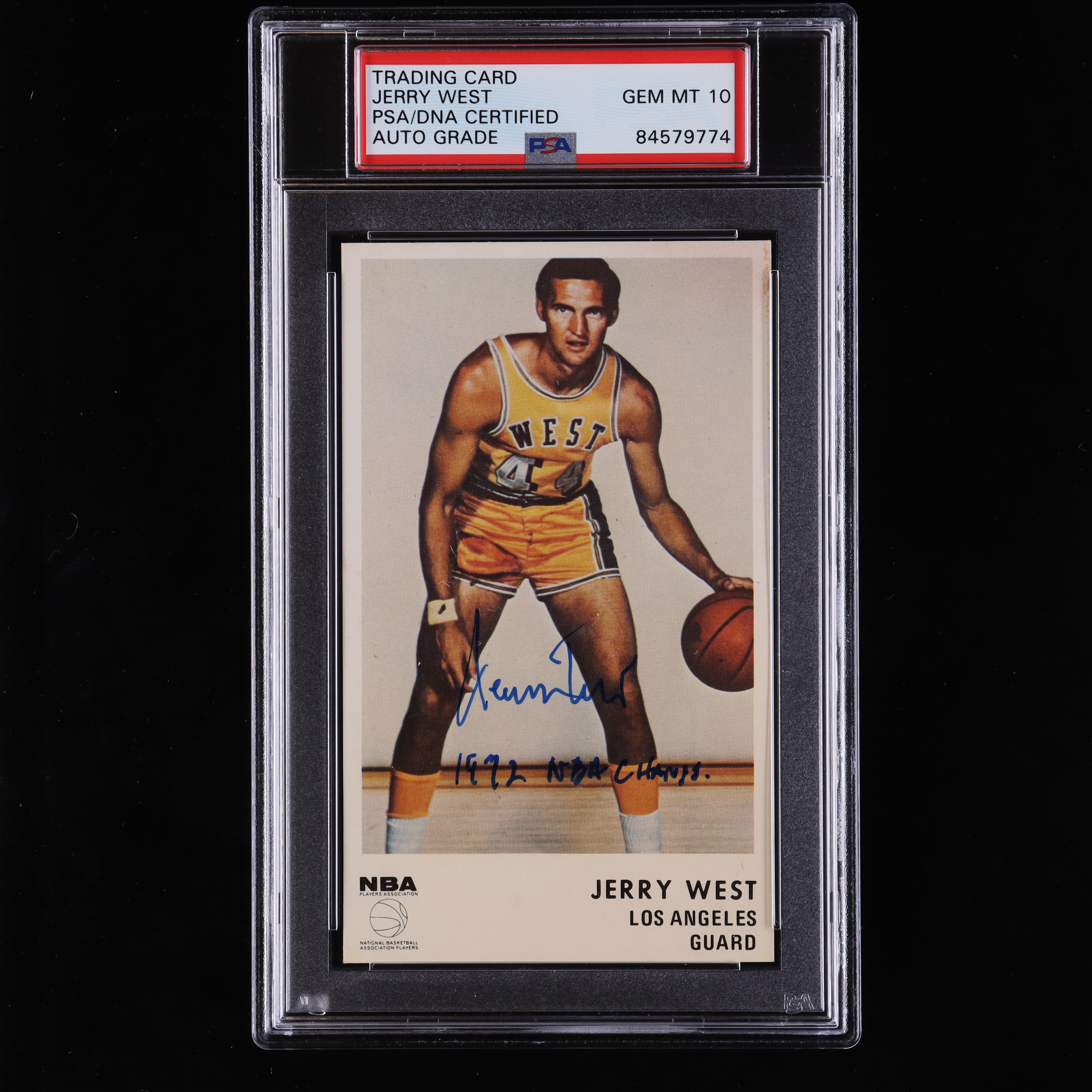 Oversized card has been hand-signed and inscribed by Jerry West (Los Angeles Lakers, HOF). Please see photos for details regarding the condition of the card.