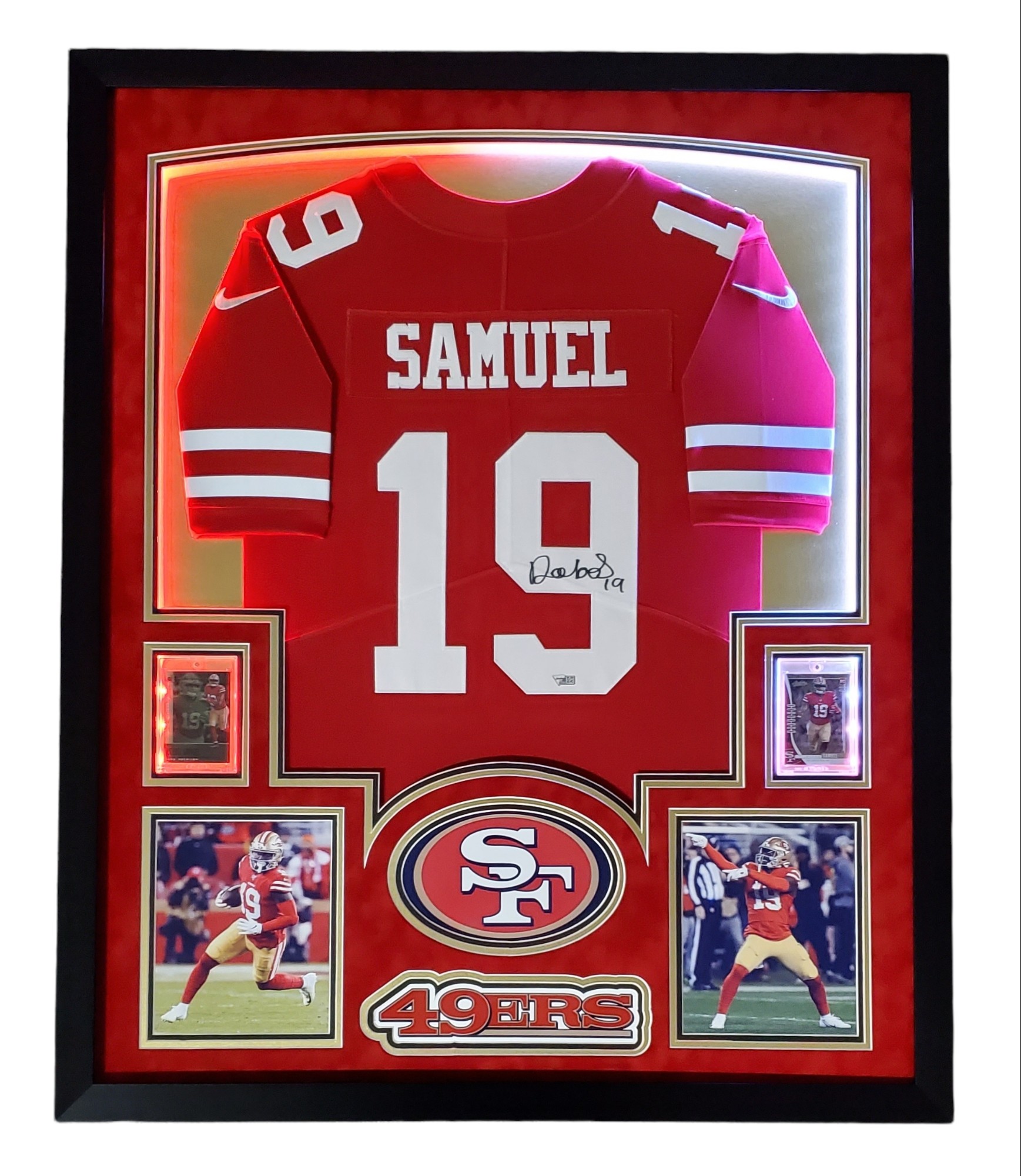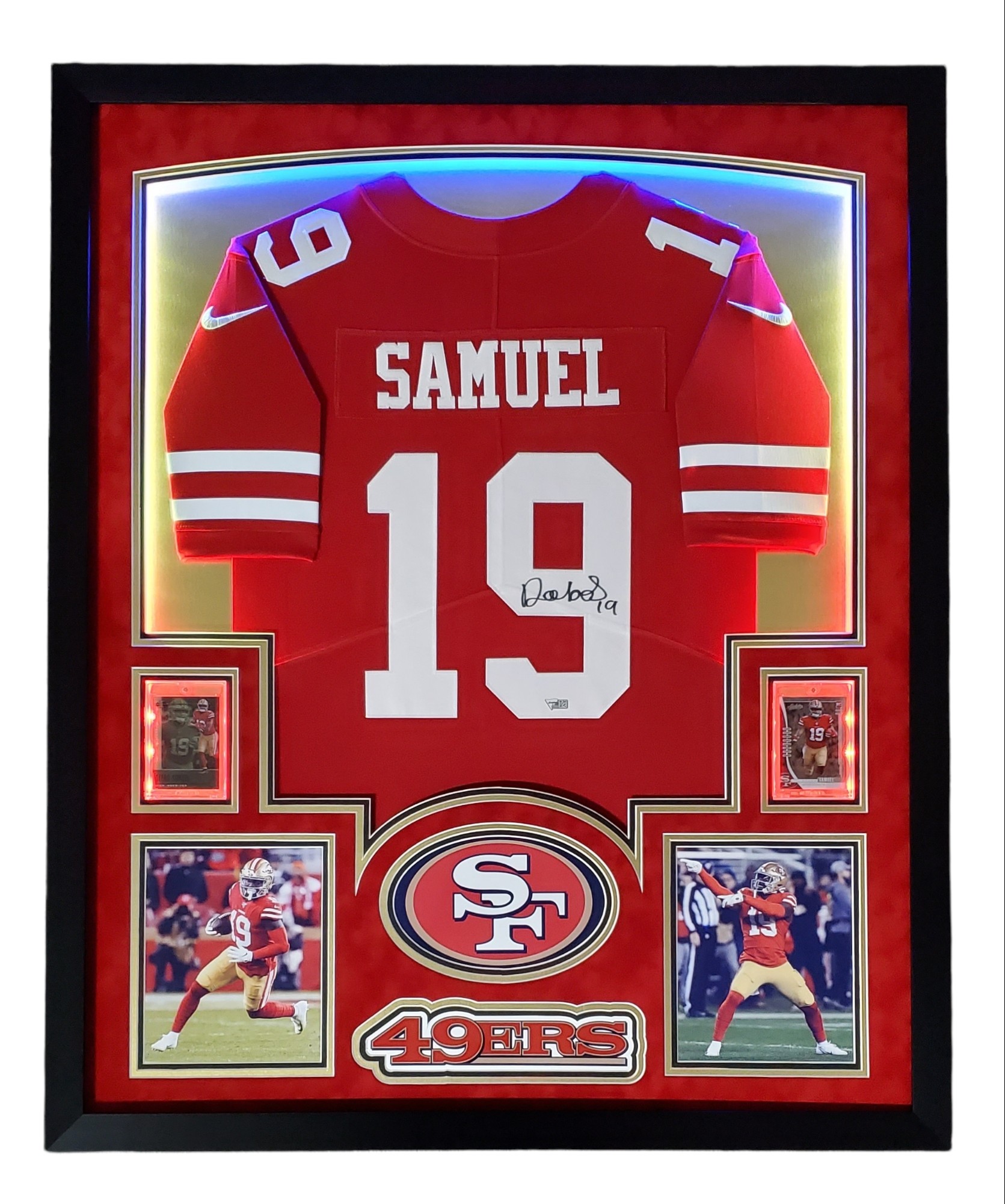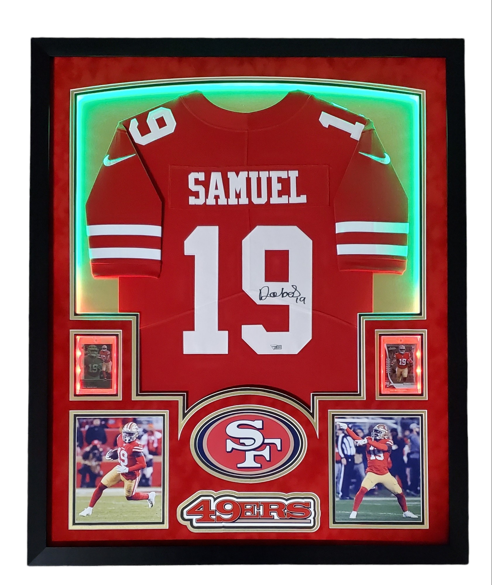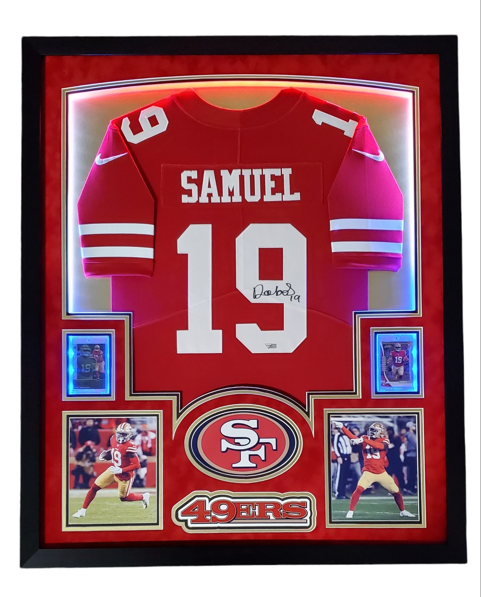 Custom framed, LED back-lit display measures 32" x 43" in size. Features a Nike Limited jersey that has been hand-signed by Deebo Samuel (San Francisco 49ers).