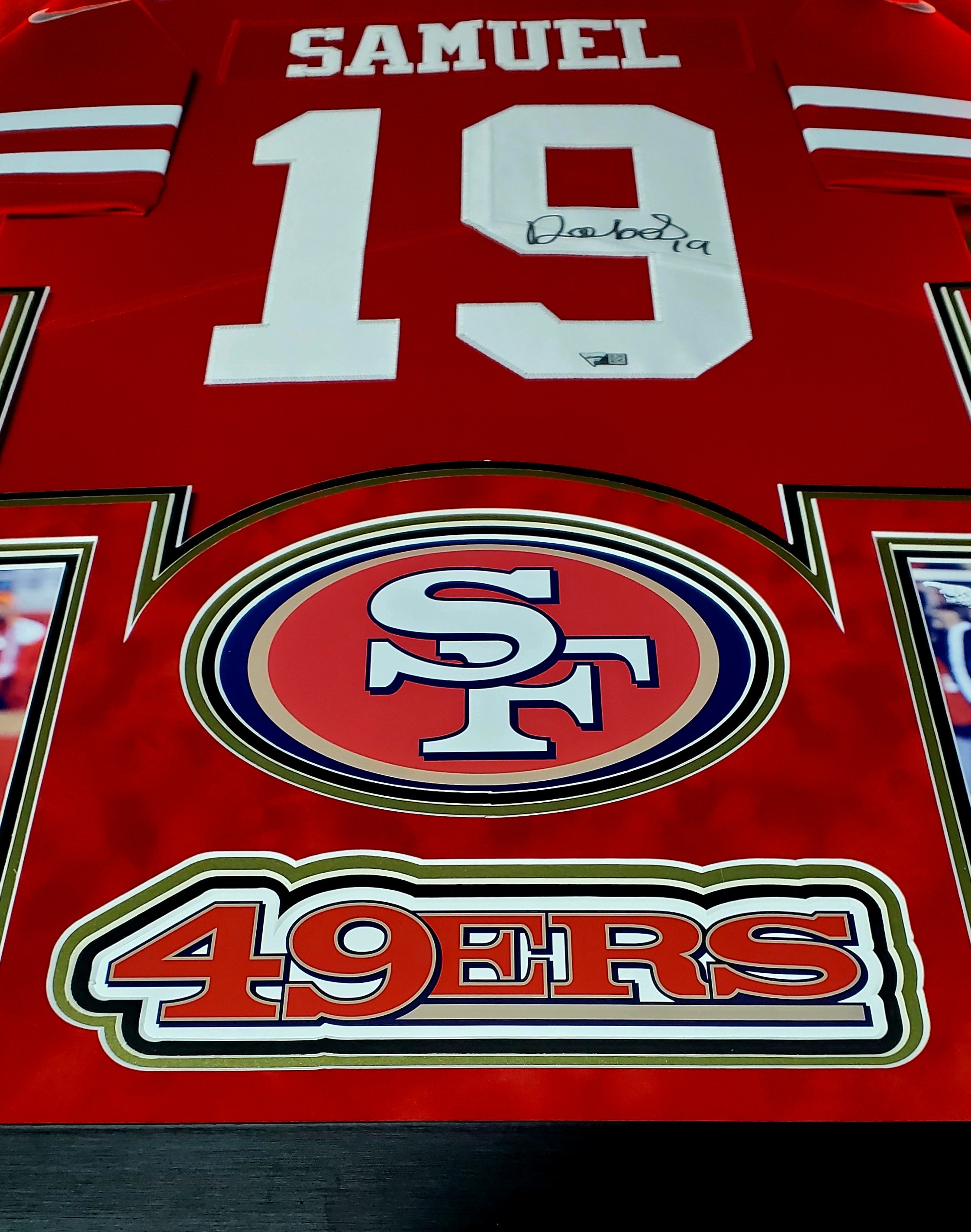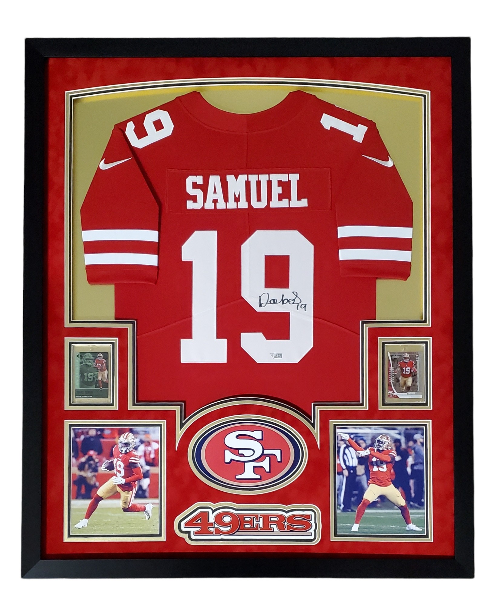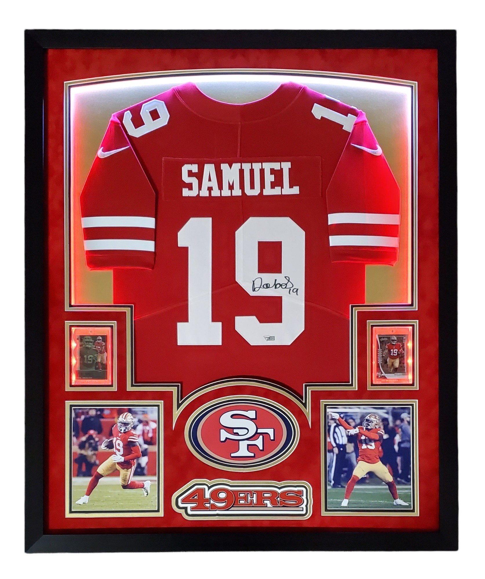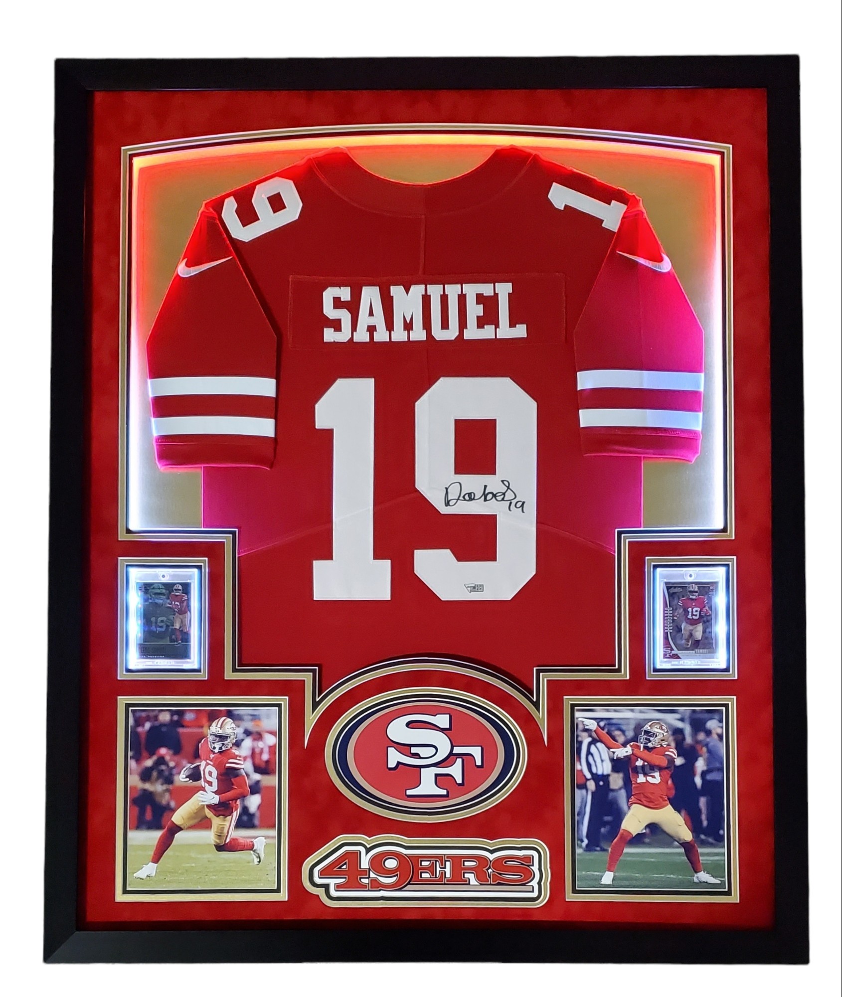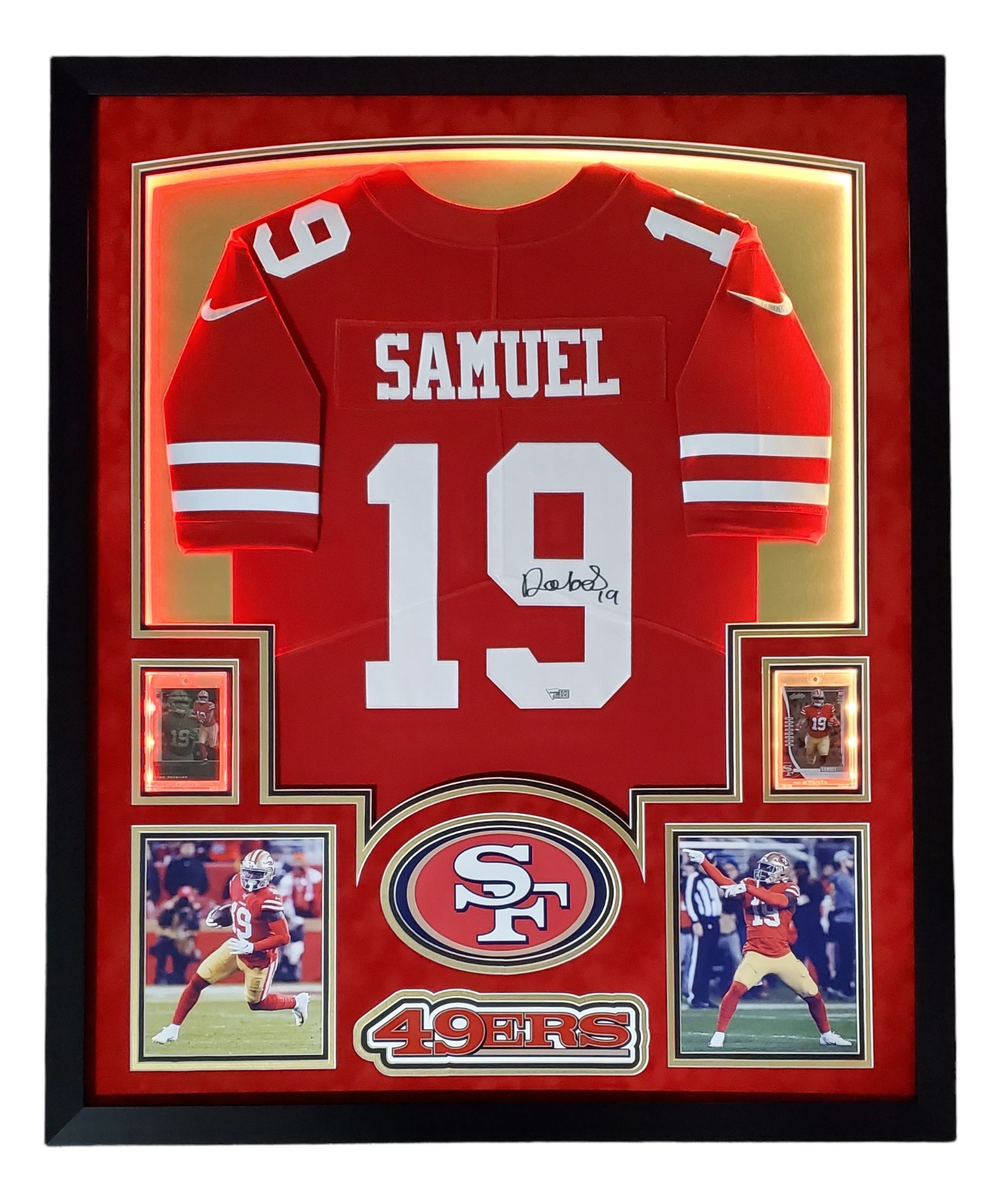 Custom framed, LED back-lit display measures 32" x 43" in size. Features a Nike Limited jersey that has been hand-signed by Deebo Samuel (San Francisco 49ers).
