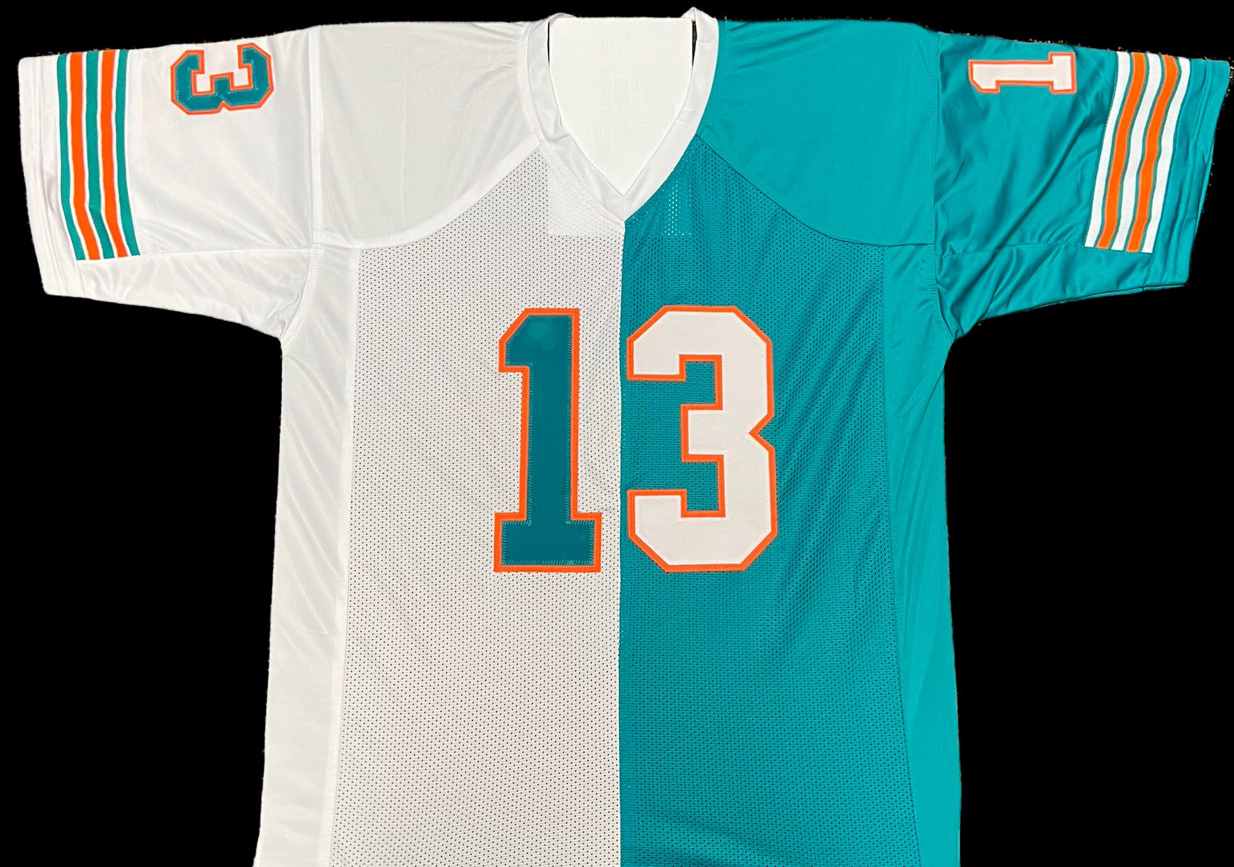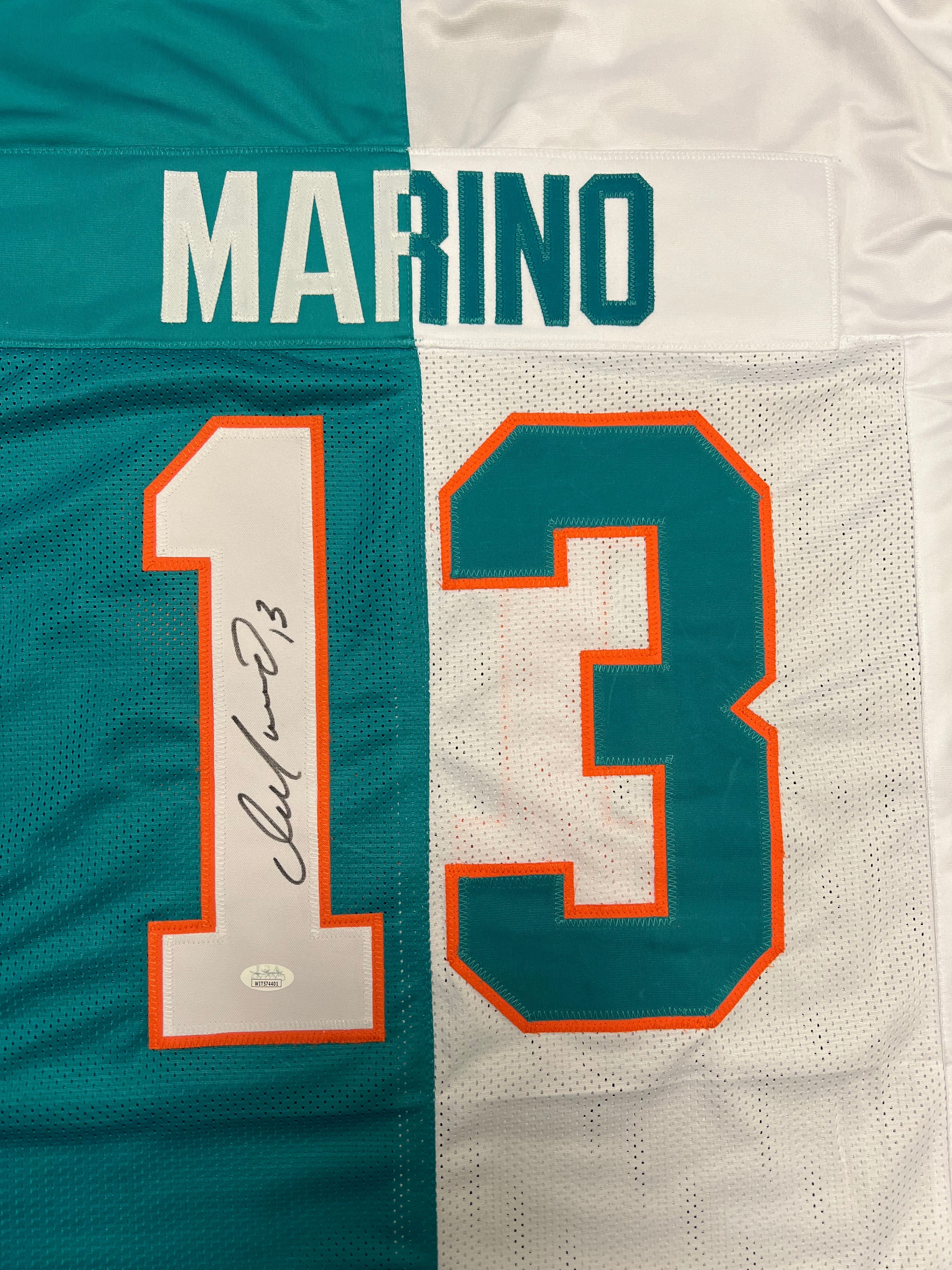 Custom on-field style jersey. Everything sewn on, size XL. Hand-signed by Dan Marino (HOF).