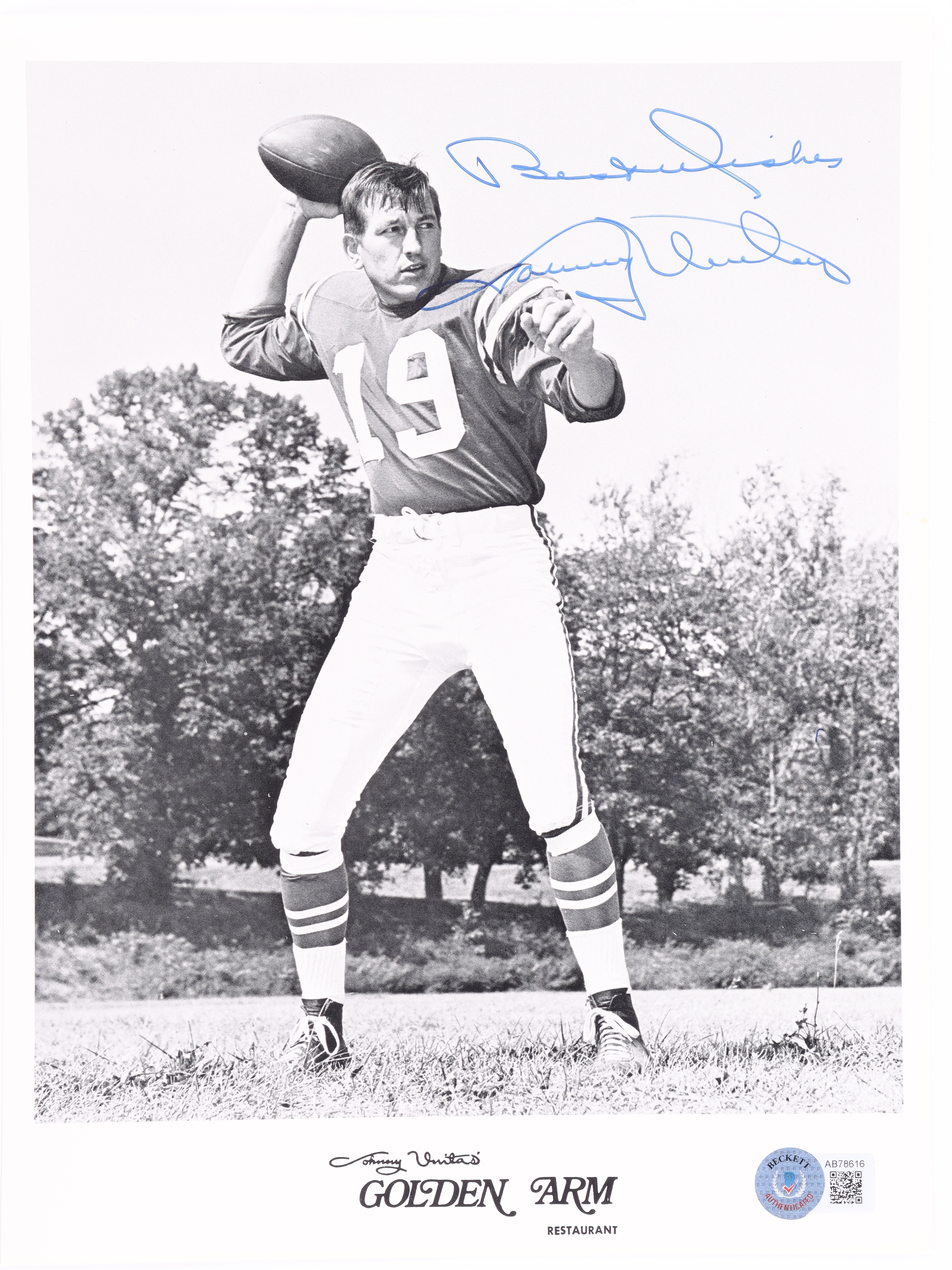 Photo measures approximately 8" x 10" in size. Hand-signed and inscribed by Johnny Unitas (D. 2002, Baltimore Colts).