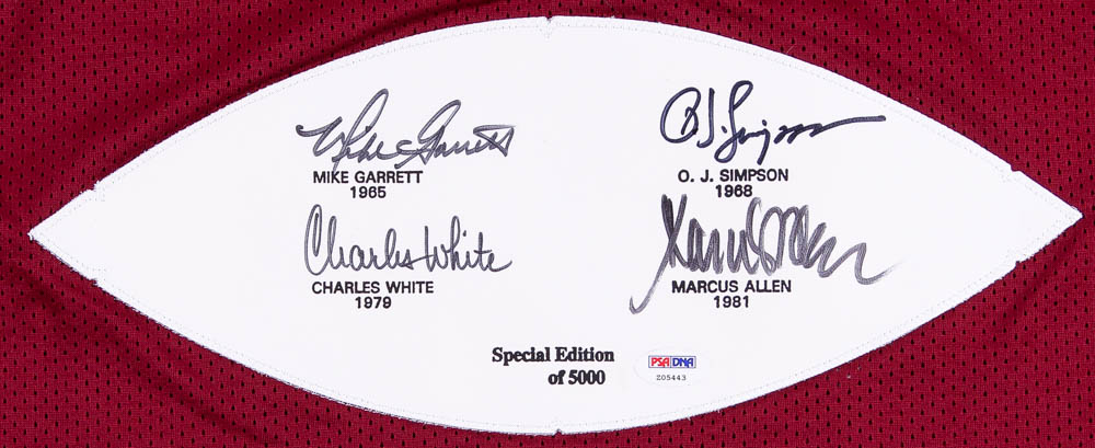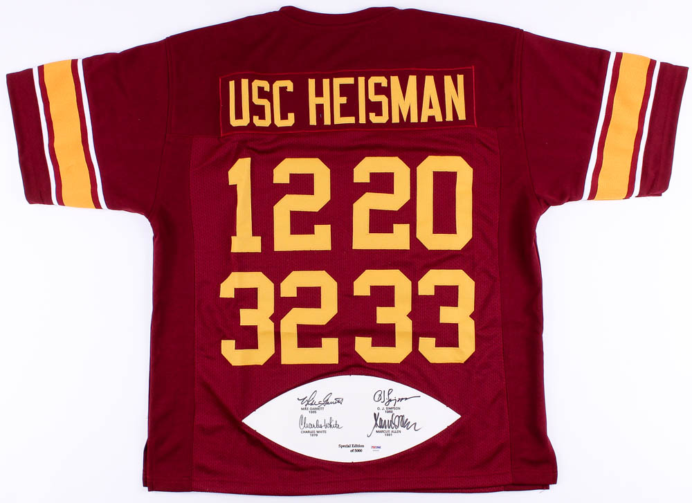 Mike Garrett, Charles White, O.J. Simpson & Marcus Allen Signed "USC Heisman" Jersey with Football Panel (PSA LOA)