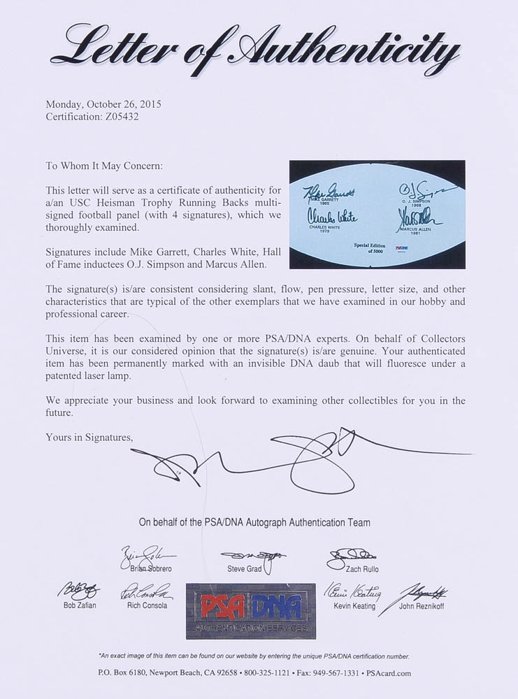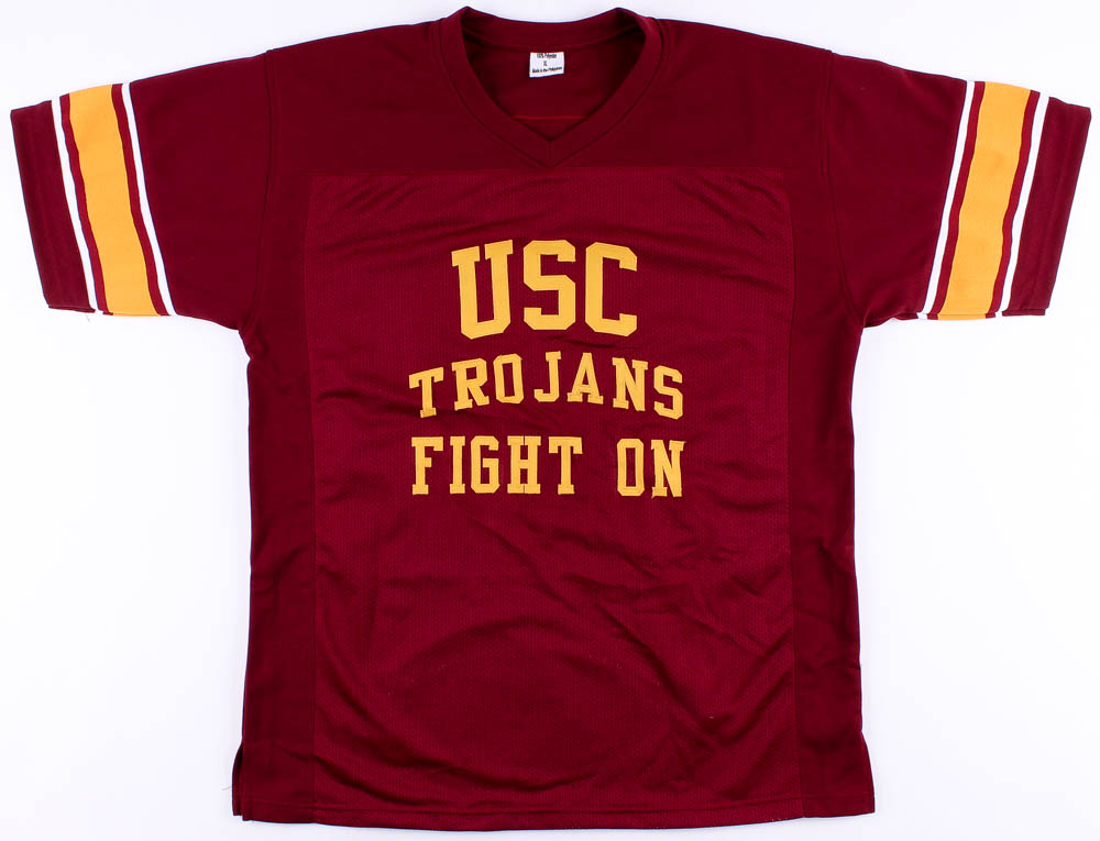 Custom on-field style jersey. Everything sewn on, size XL. Football panel has been sewn onto the jersey. The football panel has been hand-signed in black felt-tip pen by (4) USC Heisman Trophy running backs inscluding Mike Garrett, Charles White, O.J. Simpson (Bills HOF) and Marcus Allen (Raiders HOF).