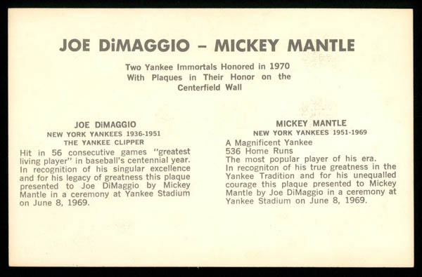 1970 Mickey Mantle & Joe Dimaggio Yankees 3x5 Photocard