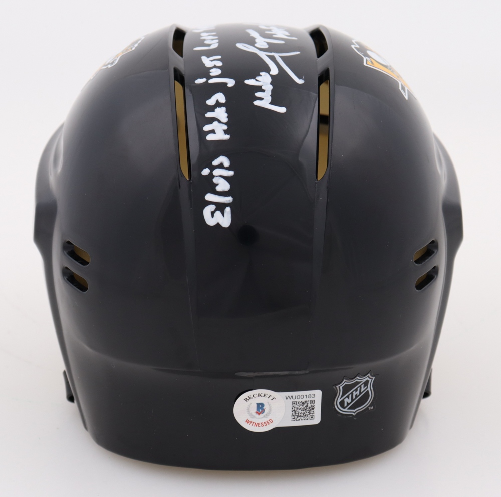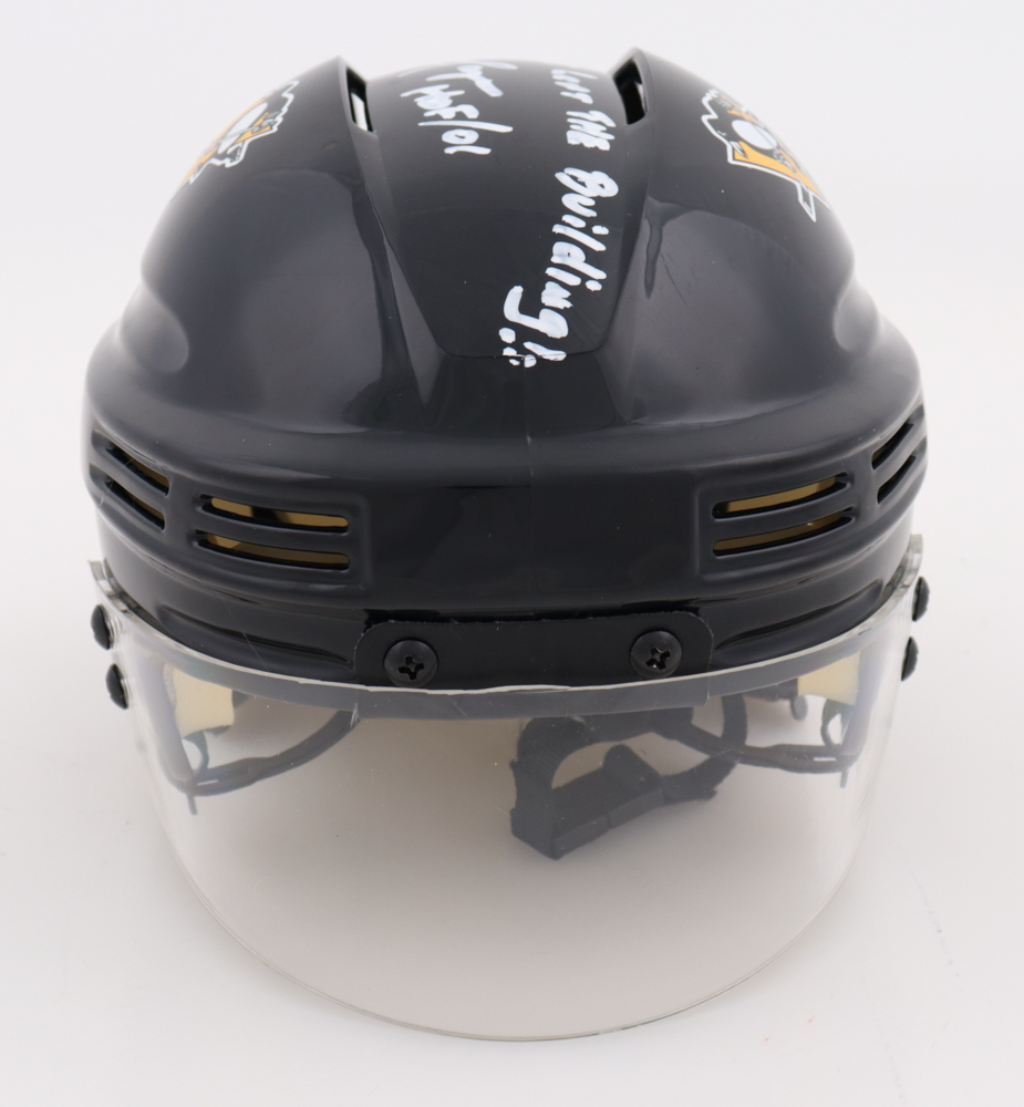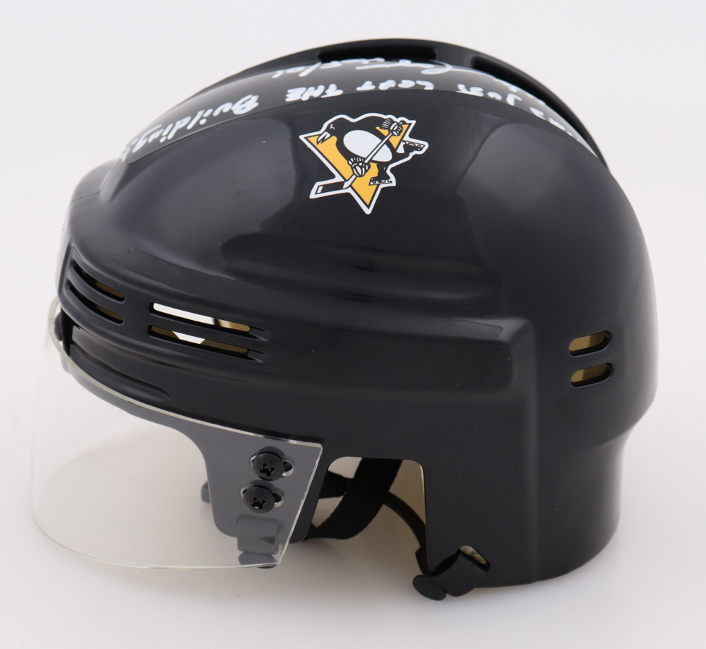 Pittsburgh Penguins mini helmet has been hand-signed and inscribed by Mike Lange (HOF).