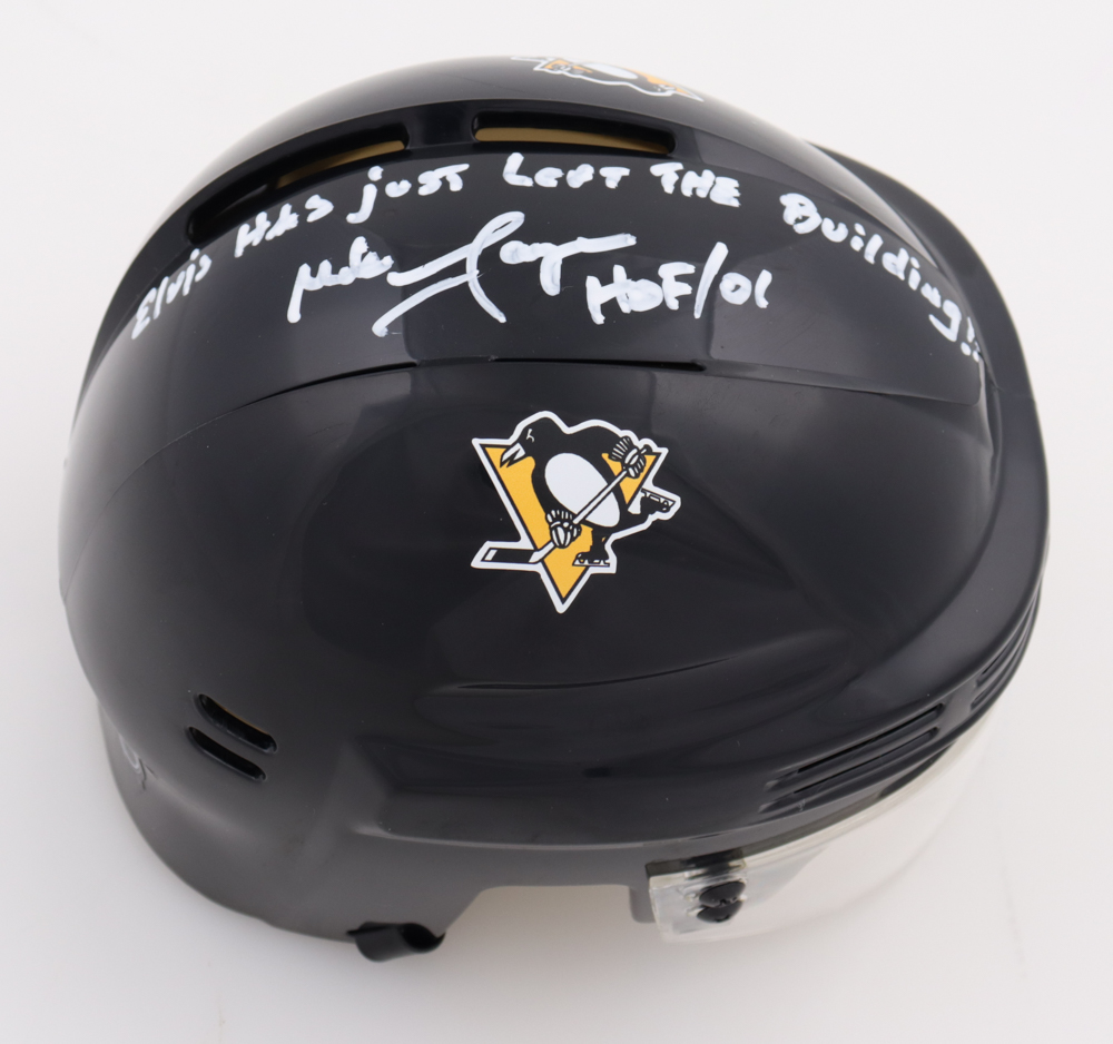 Mike Lange Signed Penguins Mini Helmet Inscribed "Elvis Has Just Left the Building!" & "HOF/01" (Beckett)