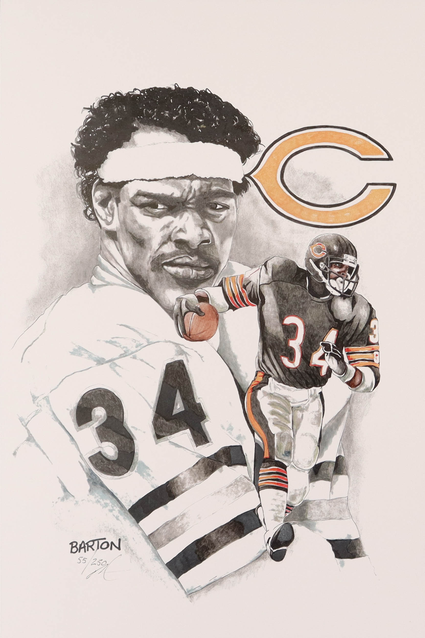 Print measures approximately 12" x 18" in size. The piece is hand-signed and numbered by the artist, Brian Barton and features Walter Payton (D. 1999, Chicago Bears, HOF).