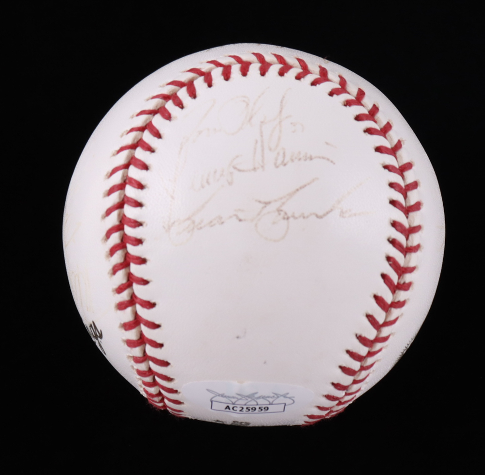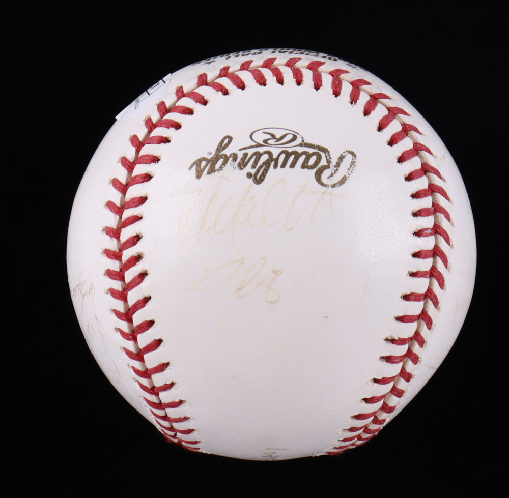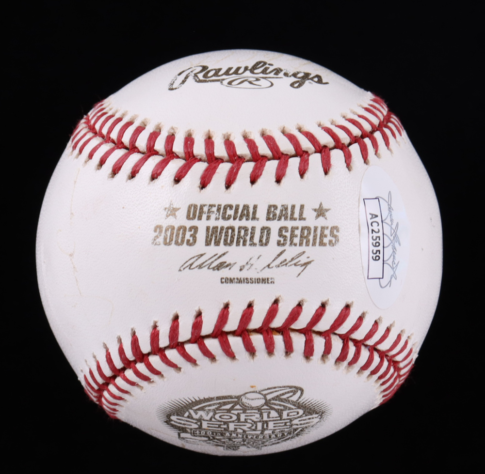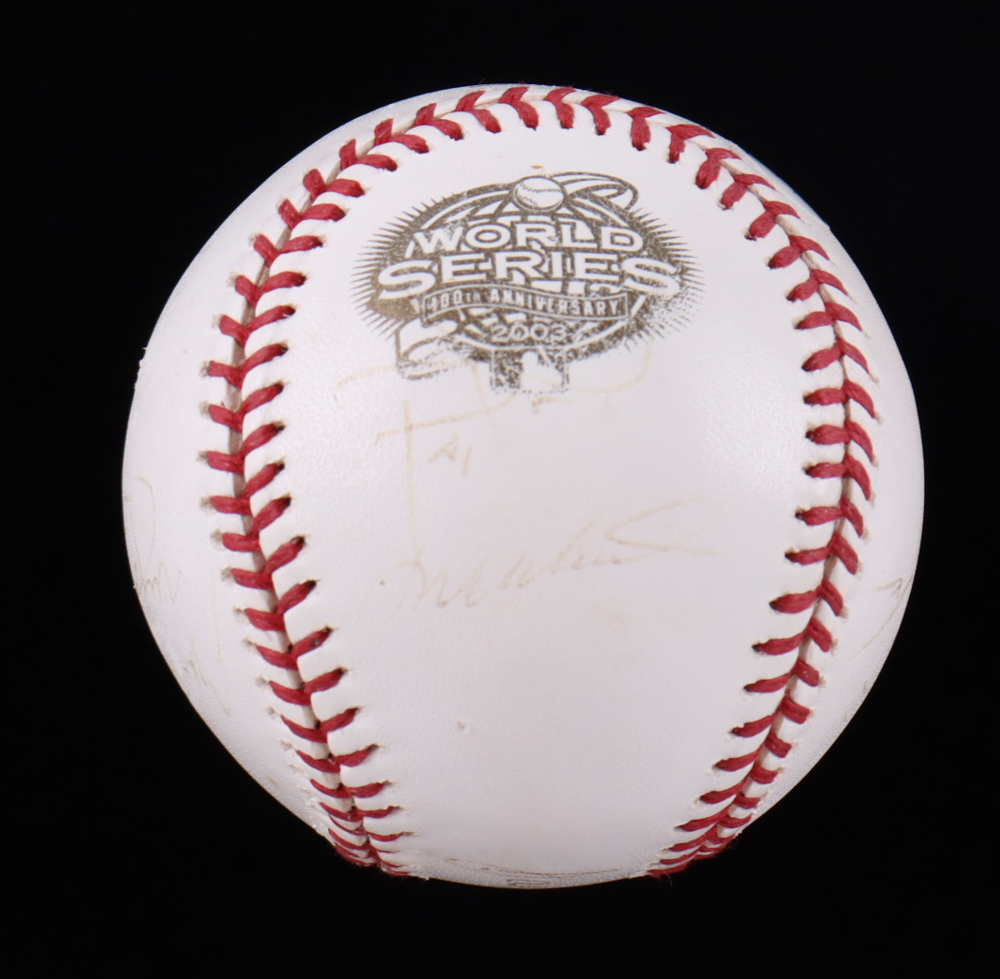 Rawlings 2003 World Series baseball. Hand-signed by (12) with Jack McKeon, Carl Pavano, Mike Lowell, Jeff Conine, Lenny Harris, Todd Hollandsworth, Derek Lee and (5) others. Please note, many of the signatures are faded.