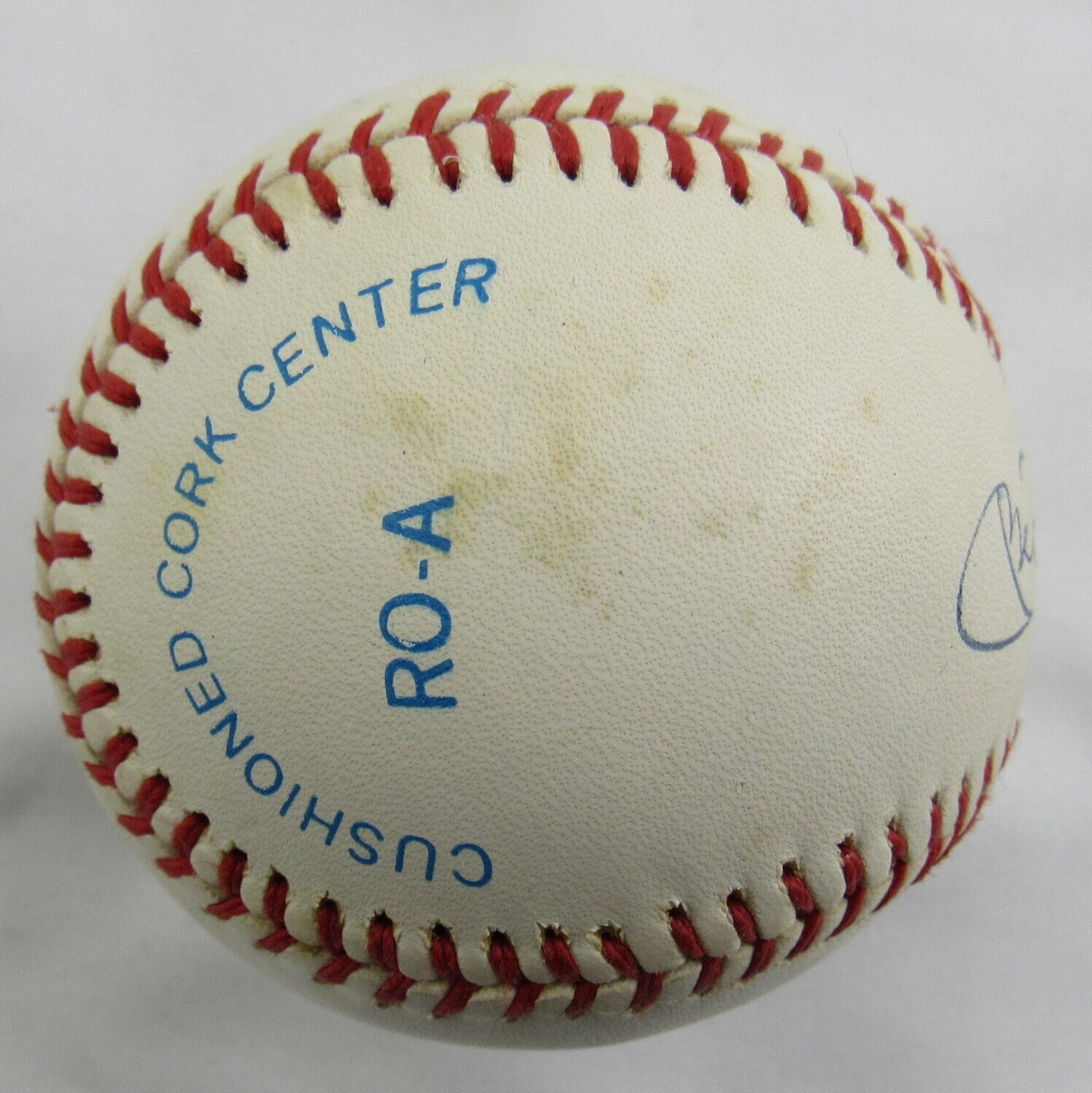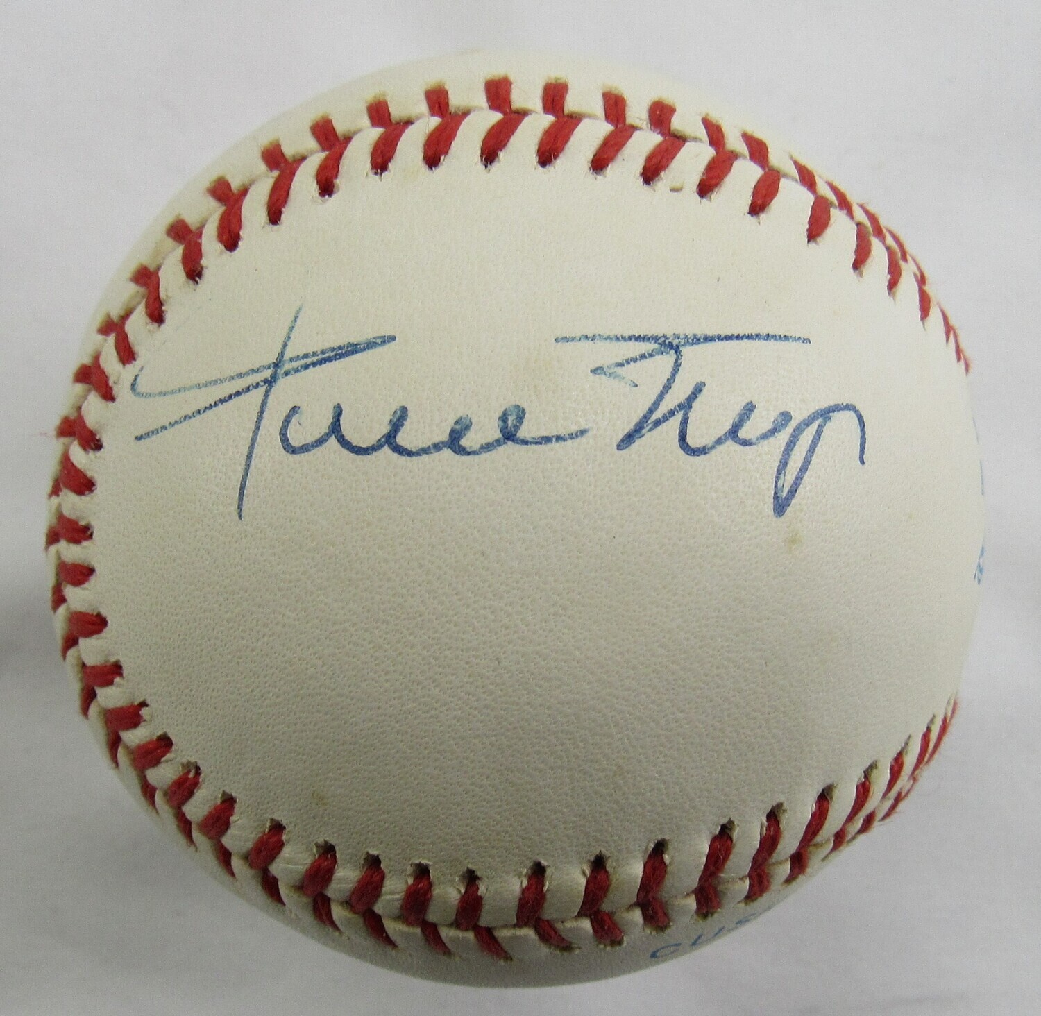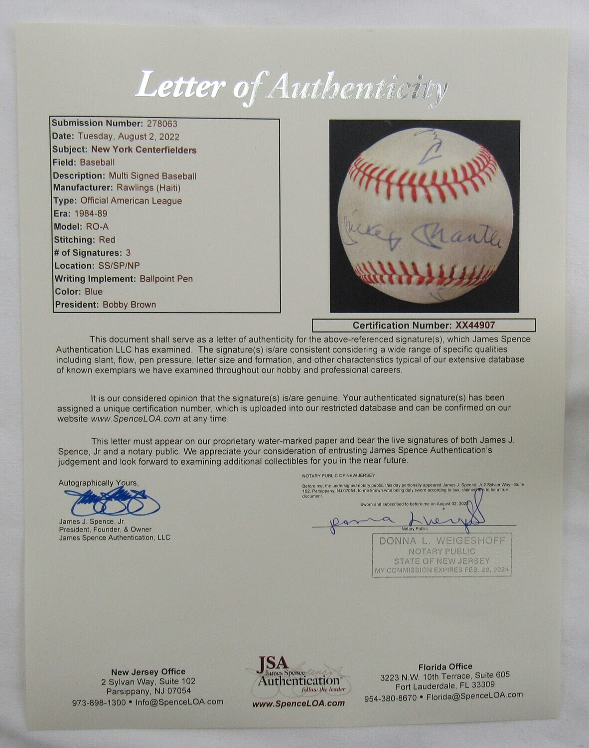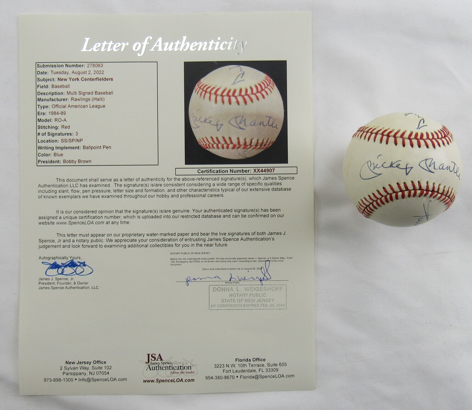 Rawlings Official American League baseball. Hand-signed by Mickey Mantle (D.1995, New York Yankees, HOF), Duke Snider (D.2011, Brooklyn Dodgers, HOF) and Willie Mays (San Francisco Giants, HOF).