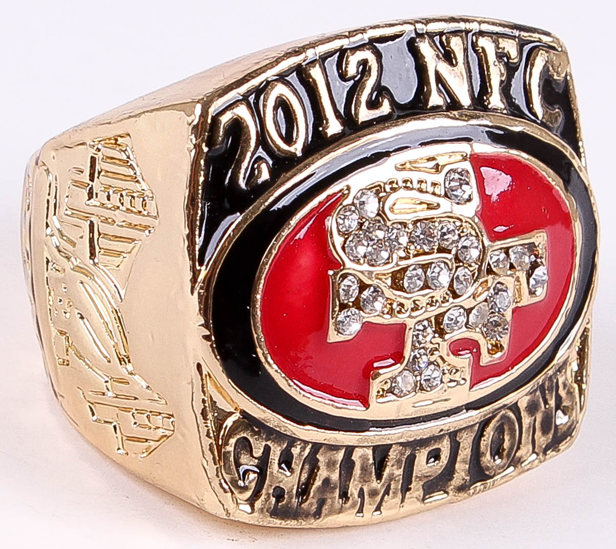 Chad Hall San Francisco 49ers High Quality Replica 2012 NFC Championship Ring. The ring has been hand crafted by professional jewelers. Made of metal alloy and clad with gold. Size 11.