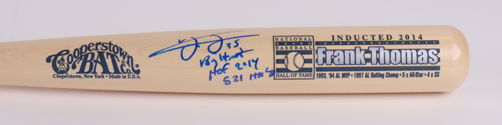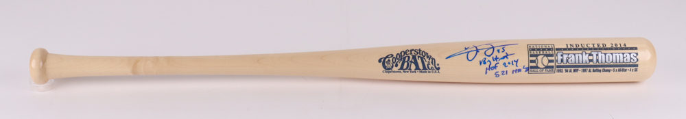 Cooperstown Thomas HOF Induction baseball bat. Hand-signed and inscribed by Frank Thomas (Chicago White Sox, HOF).