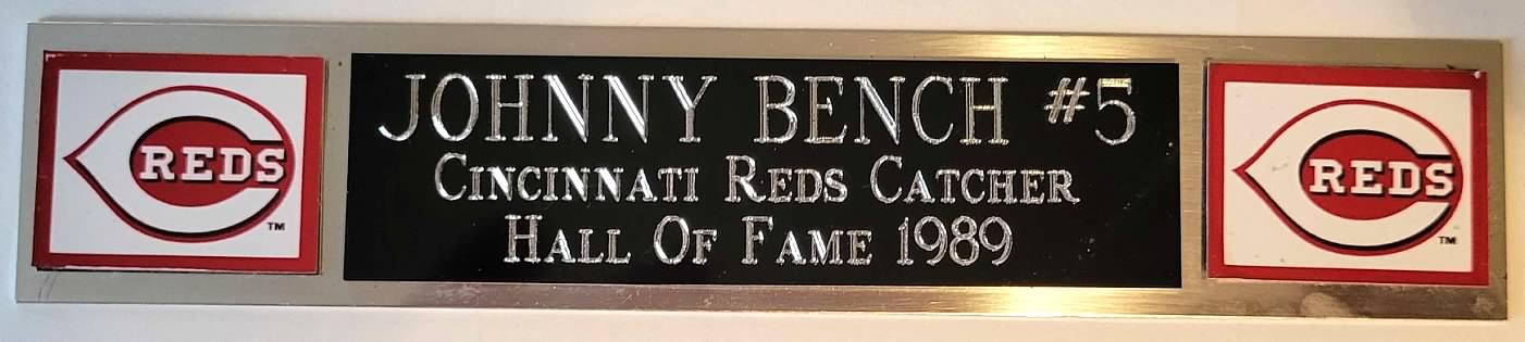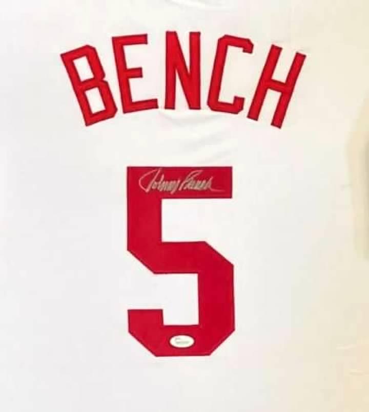 Custom display measures 35 x 43 in size. Features a custom jersey that has been hand-signed by Johnny Bench (HOF).