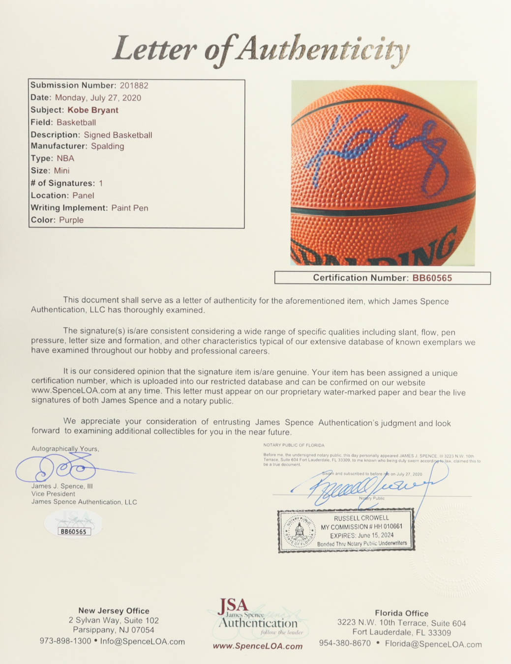 Spalding NBA Mini Basketball. Hand-signed by Kobe Bryant (D. 2020, Los Angeles Lakers).