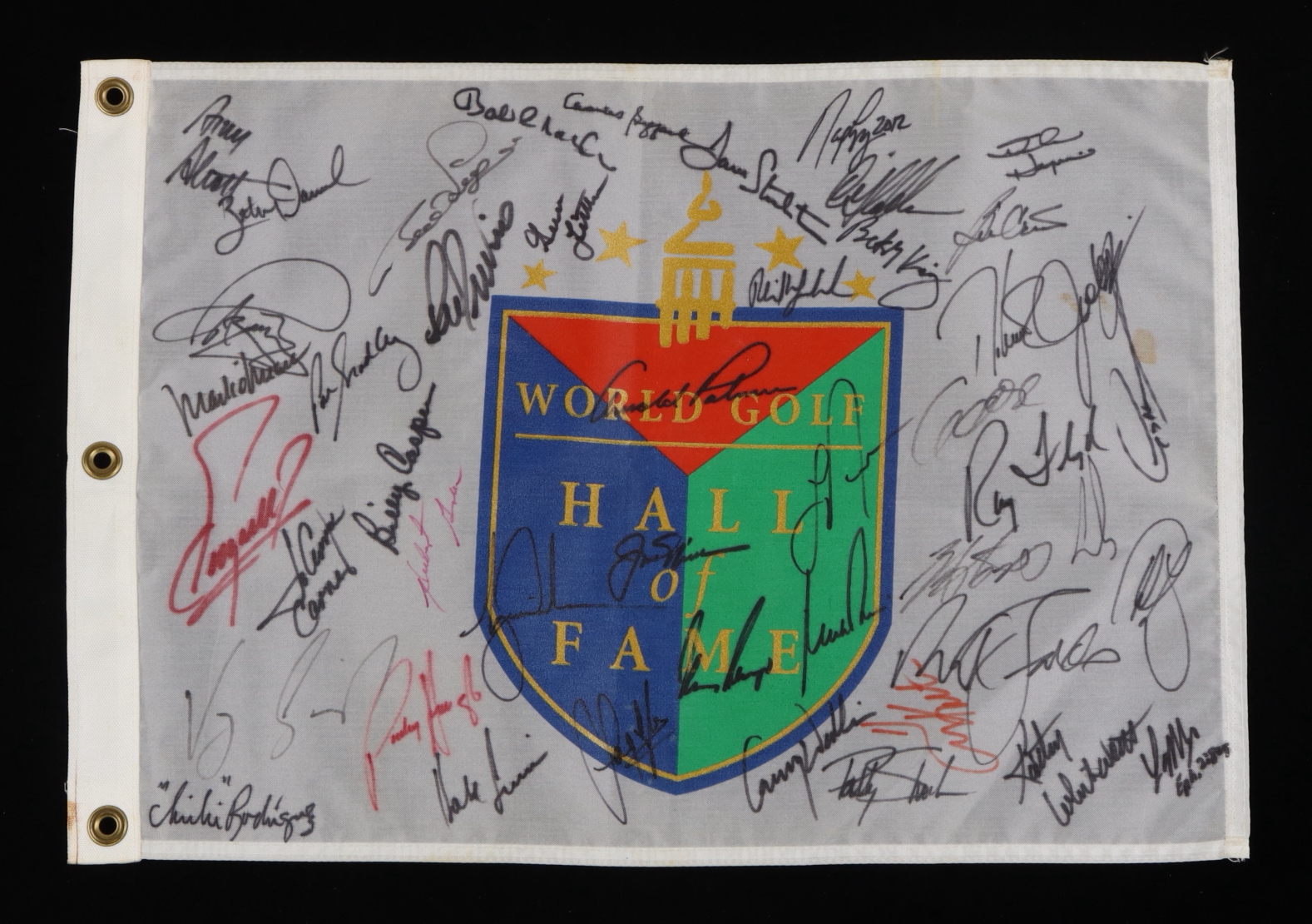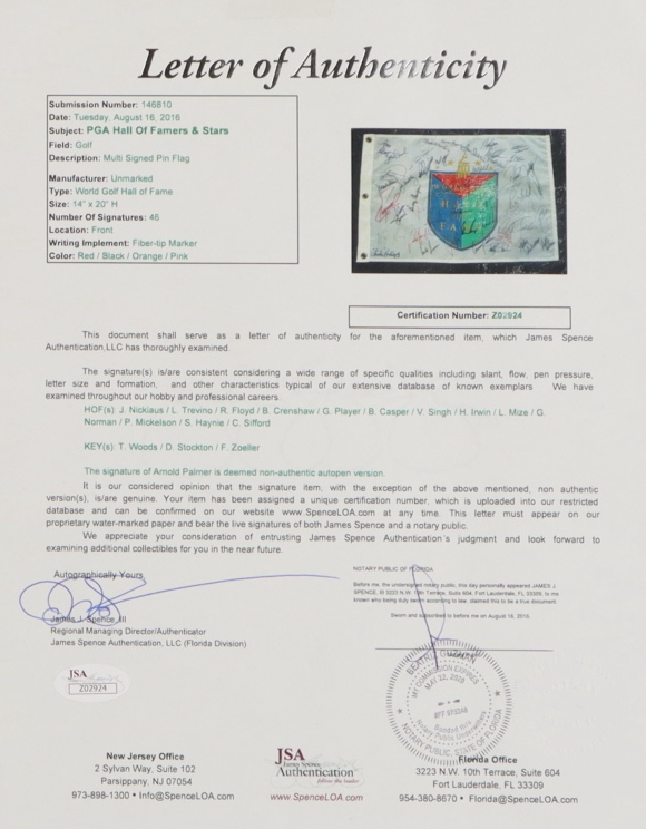 World Golf Hall of Fame golf pin flag measures approximately 13.5" x 20" in size and has been hand-signed by (46) including Jack Nicklaus (HOF), Tiger Woods (HOF), Phil Mickelson (HOF), Gary Player (HOF), Ben Crenshaw (HOF), Vijay Singh (HOF) and (40) others. Please note, the signature of Arnold Palmer is deemed non-authentic autopen version. See photos for more details.