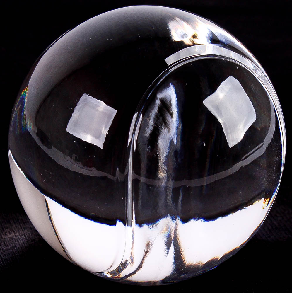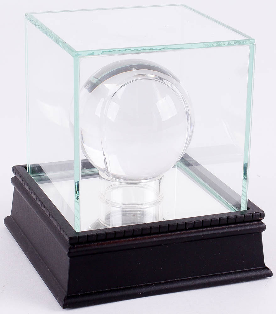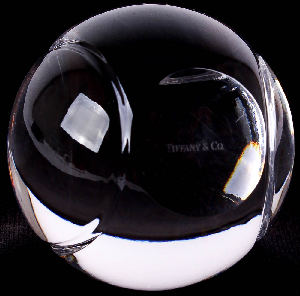 Tiffany and Company crystal Tennis Ball. Please note Item is unsigned. The auction also includes a Steiner display case with a wood base and glass cube.