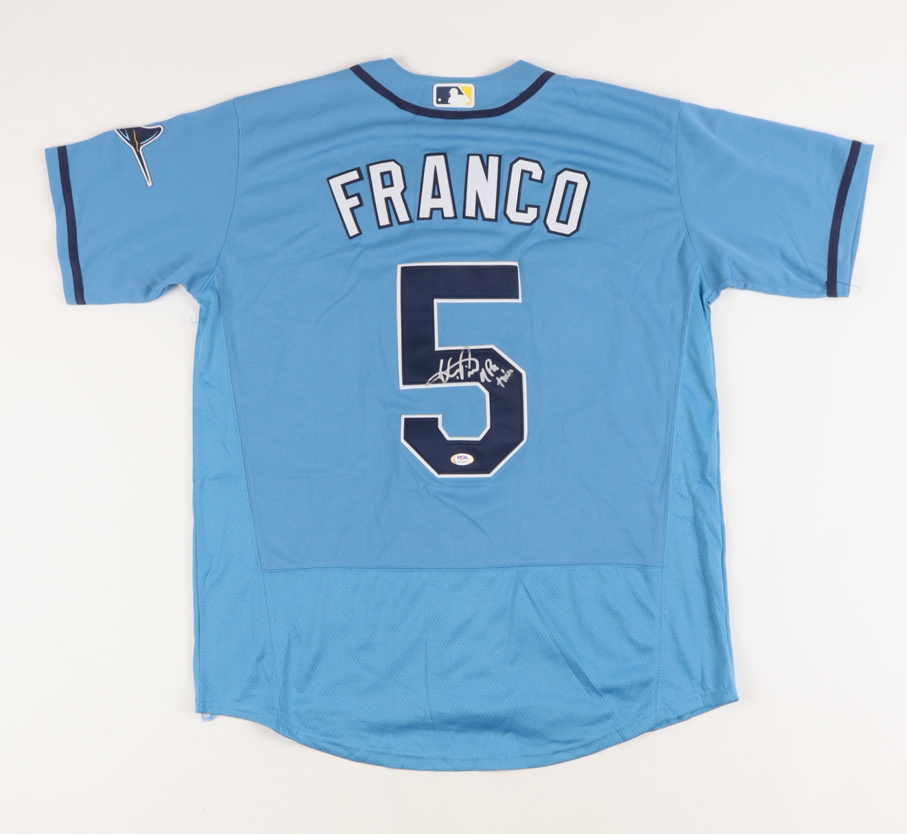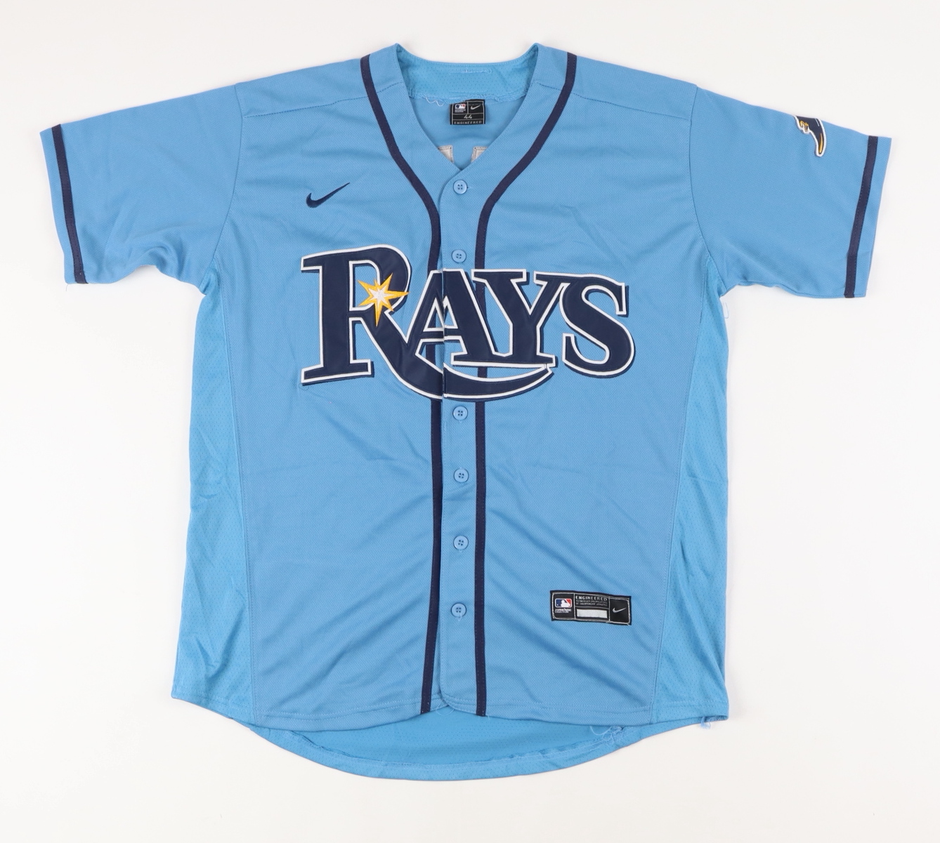 Nike on-field style jersey. Everything sewn on, size L. Hand-signed by Wander Franco (Tampa Bay Rays).