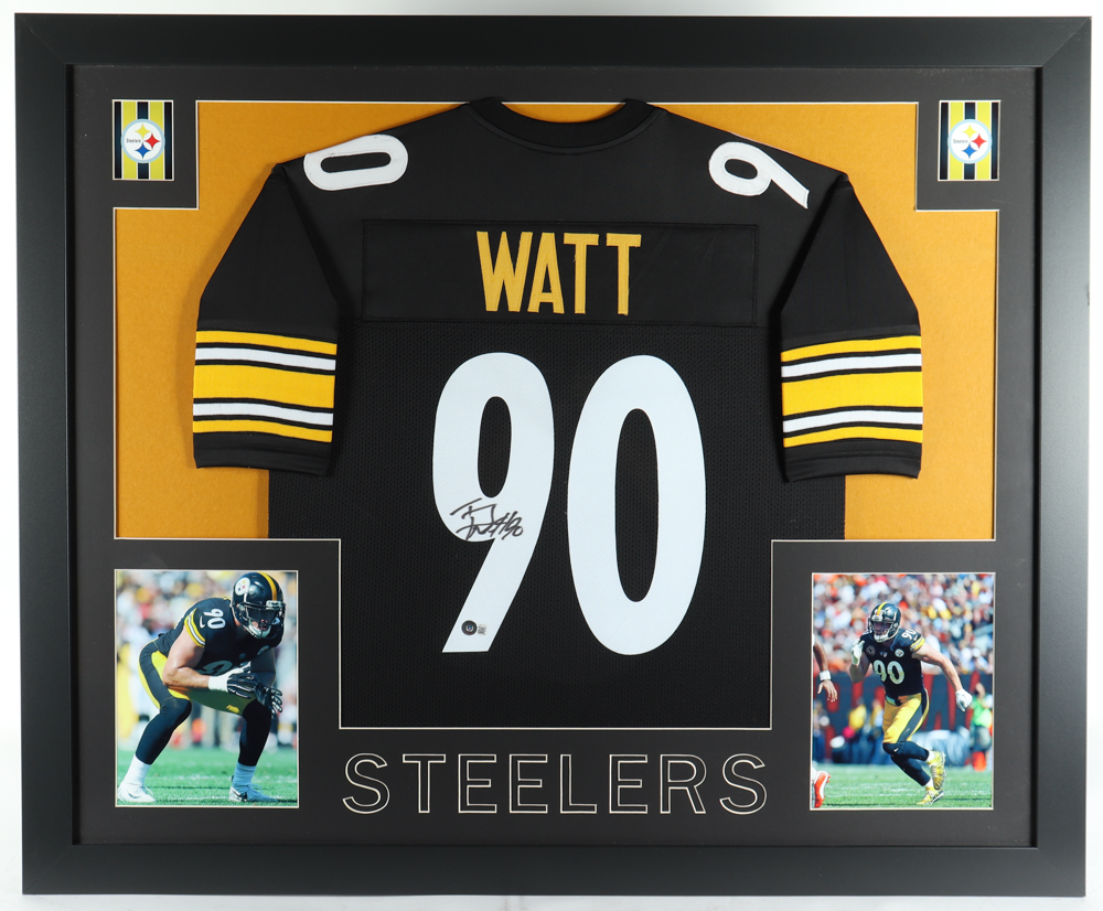 Custom frame measures approximately 35" x 43" in size and features a jersey hand-signed by T.J. Watt. Please note that the frame is damaged.