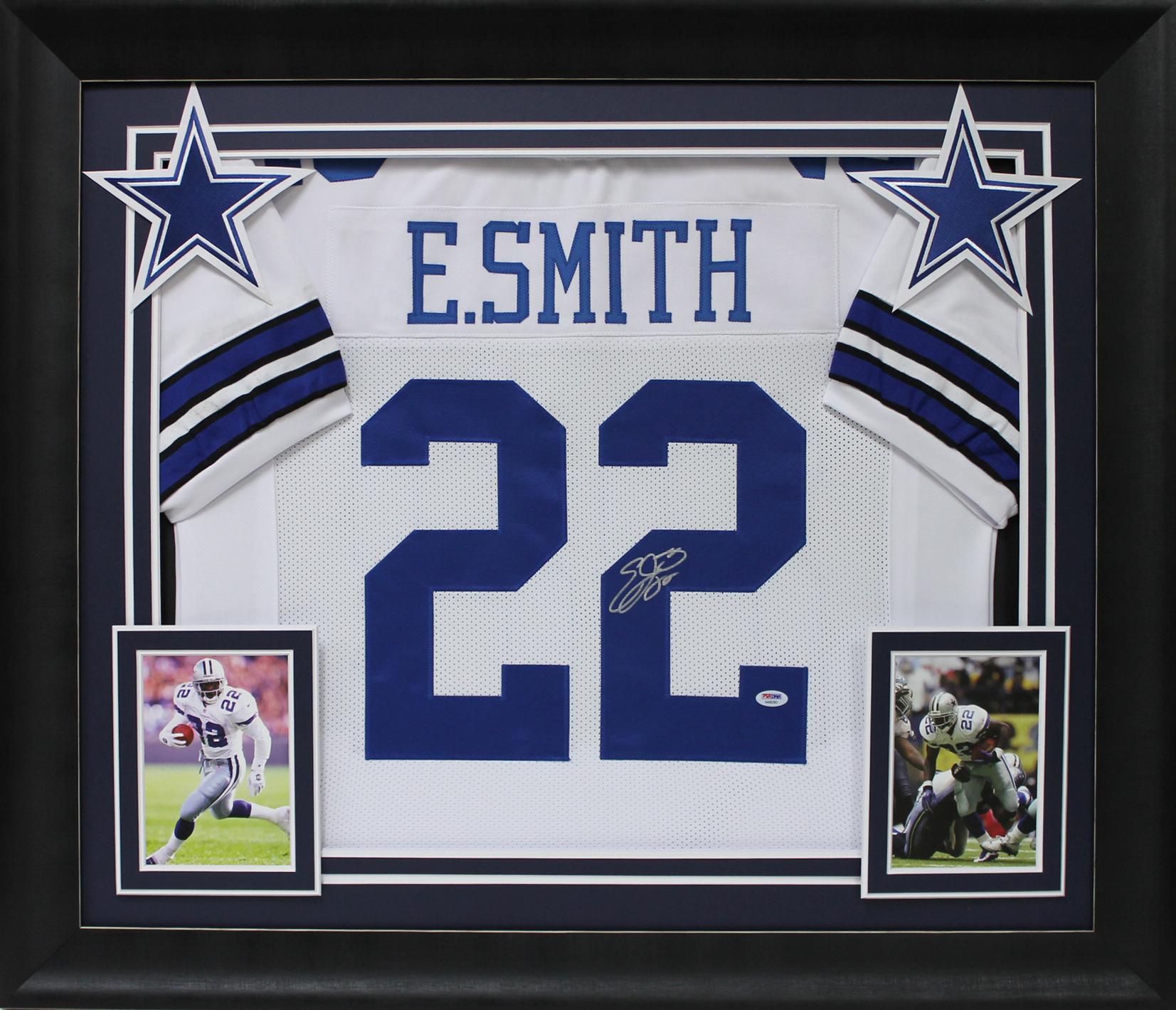 Custom frame measures approximately 32" x 37" in size and features a jersey hand-signed by Emmitt Smith (HOF).