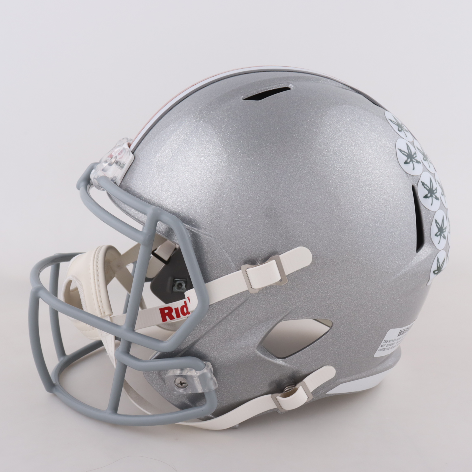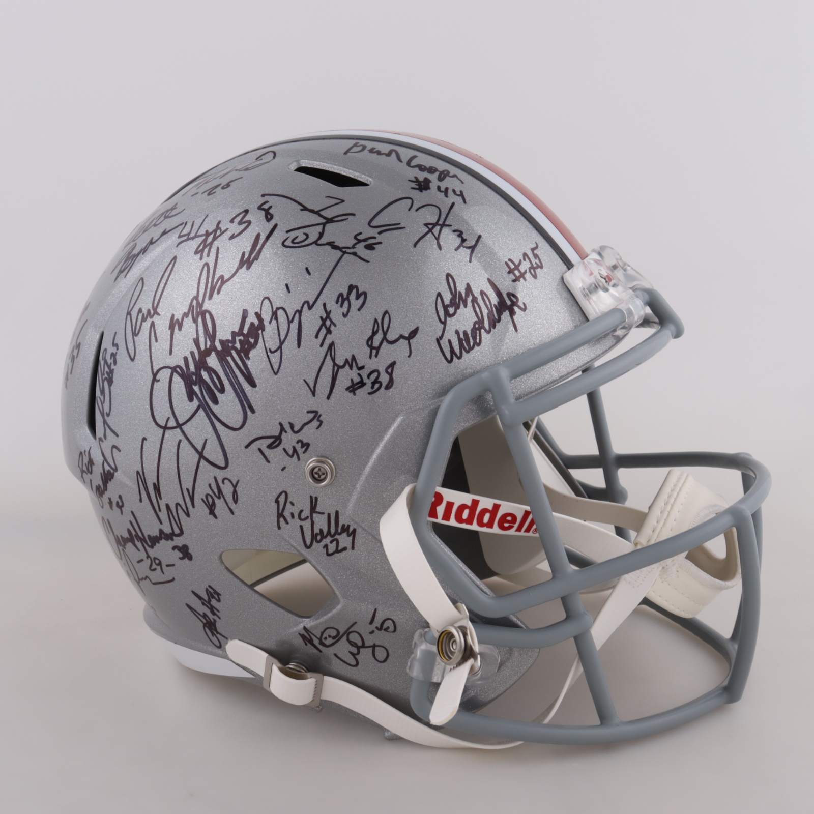 Riddell Ohio State Buckeyes full-size replica Speed helmet. Hand-signed (23) with Tim Spencer, Jeff Logan, Derek Combs, Pete Johnson, Michael Wiley, Chris Beanie Wells, Ric Volley, Champ Henson, Jim Otis, Paul Campbell, Vince Workman, John Woolridge, Keith Byars, George Cooper, Mike Weber, Jr., Antonio Pittman, Carlos Snow, Carlos Hyde, Vaughn Broadnax, Pepe Pearson, Butler B'ynote', Jordan Hall, and Rick Galbos.