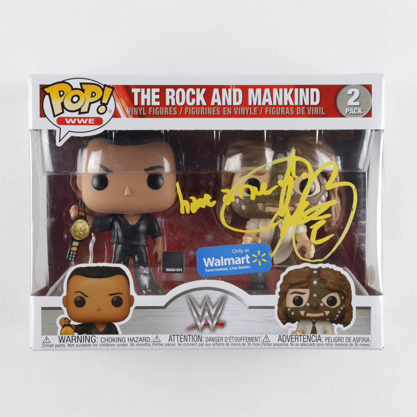 Funko Pop! figures measure approximately 4" tall. Hand-signed and inscribed on the packaging by Mick Foley (HOF).