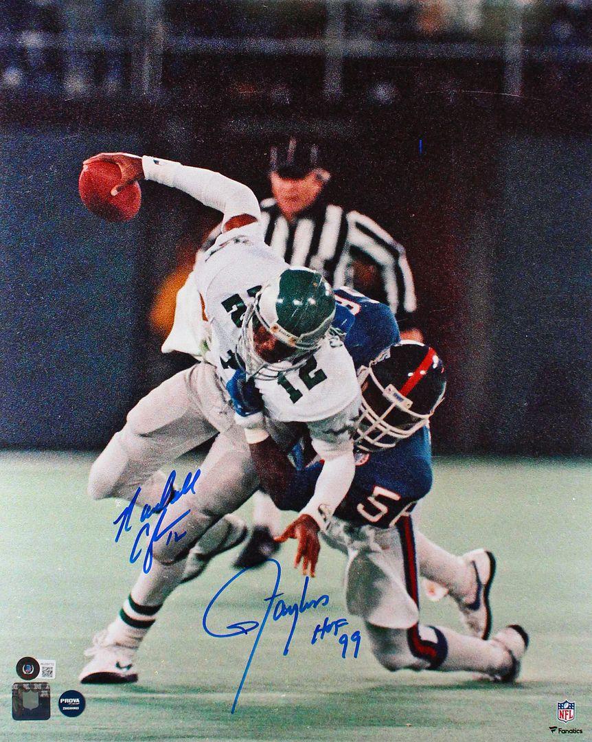 Photo measures 16" x 20" in size and has been hand-signed by Randall Cunningham (Philadelphia Eagles) and Lawrence Taylor (New York Giants, HOF).